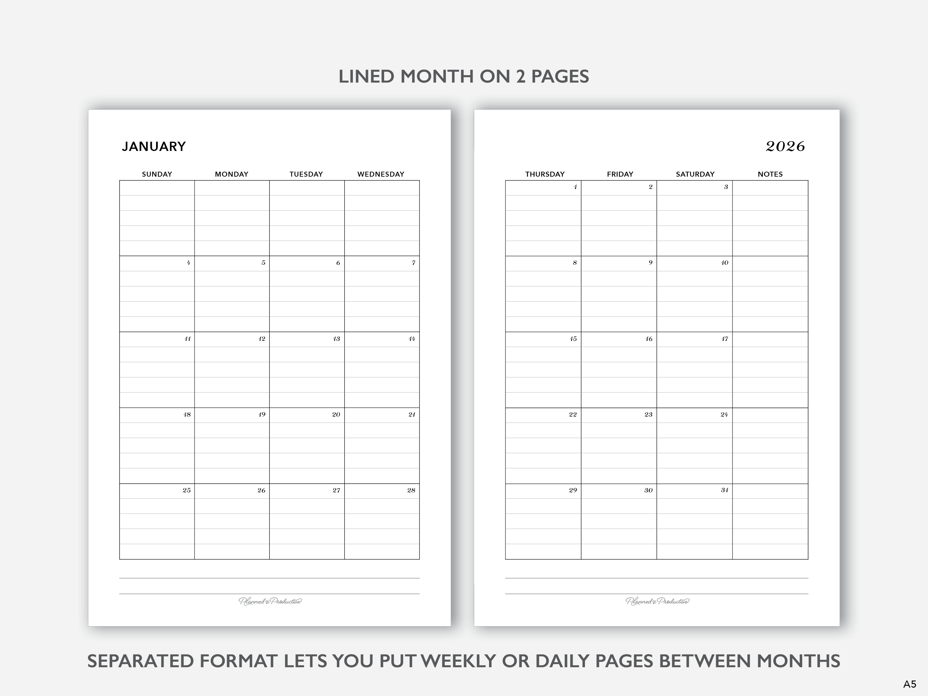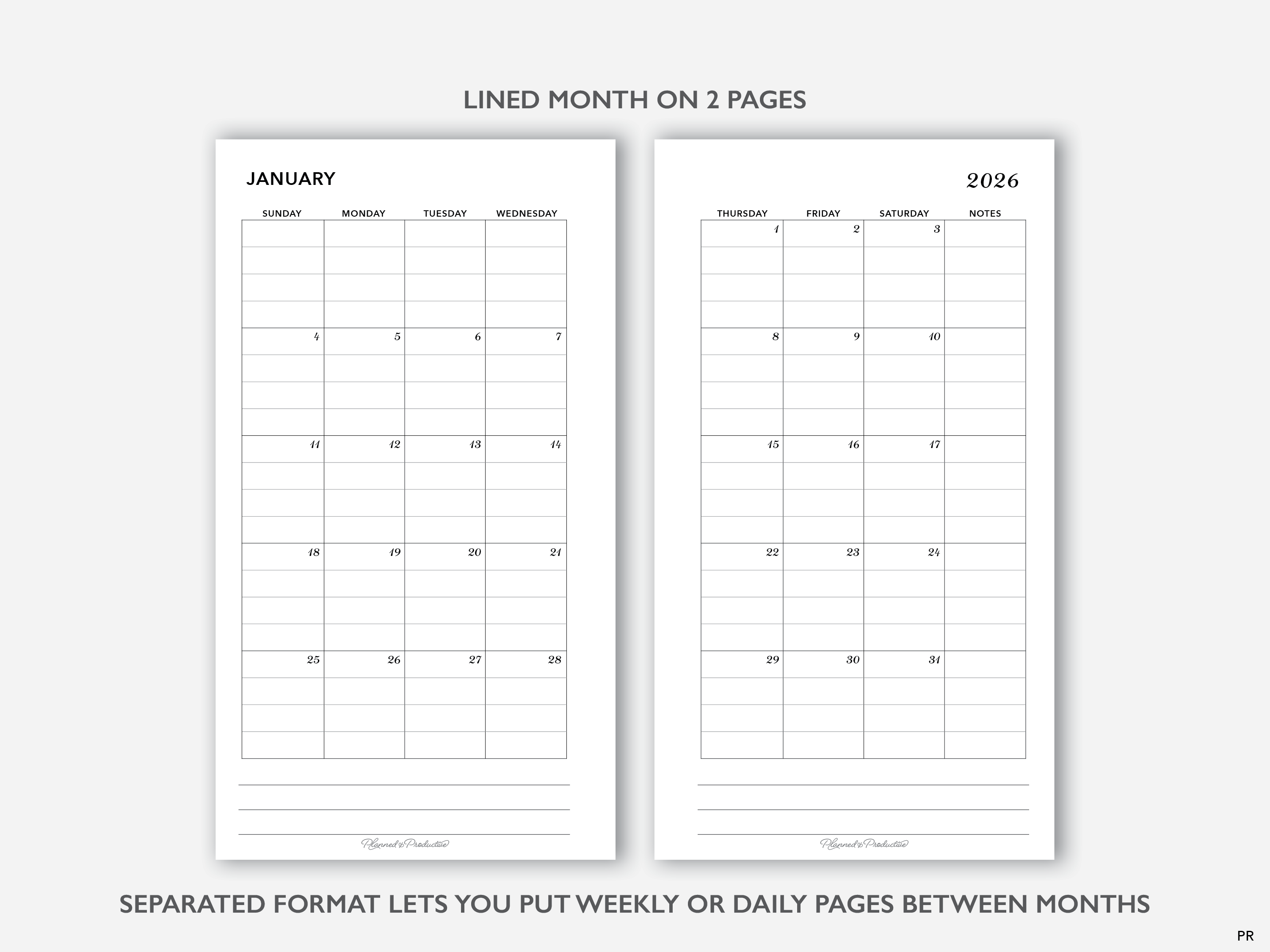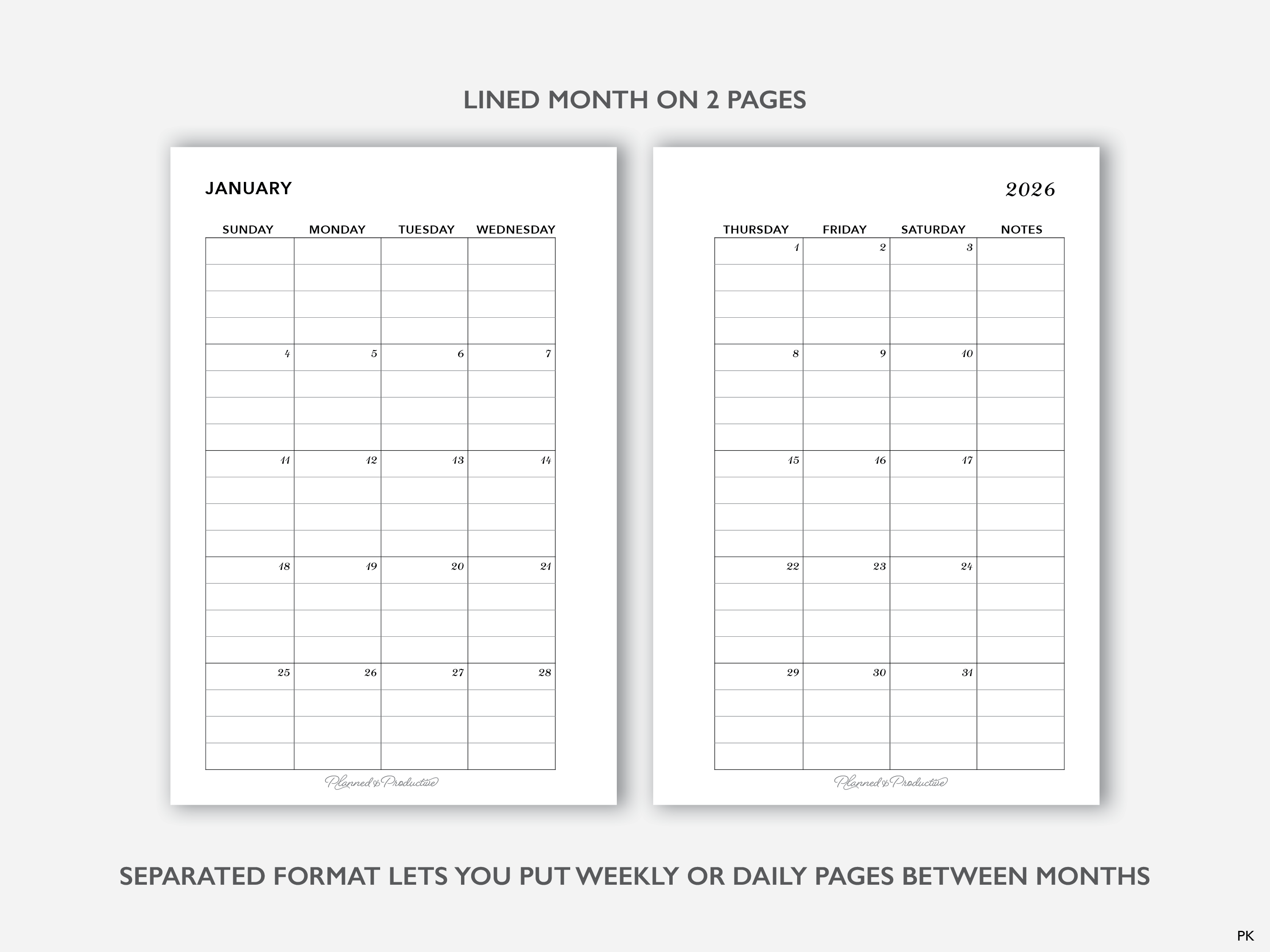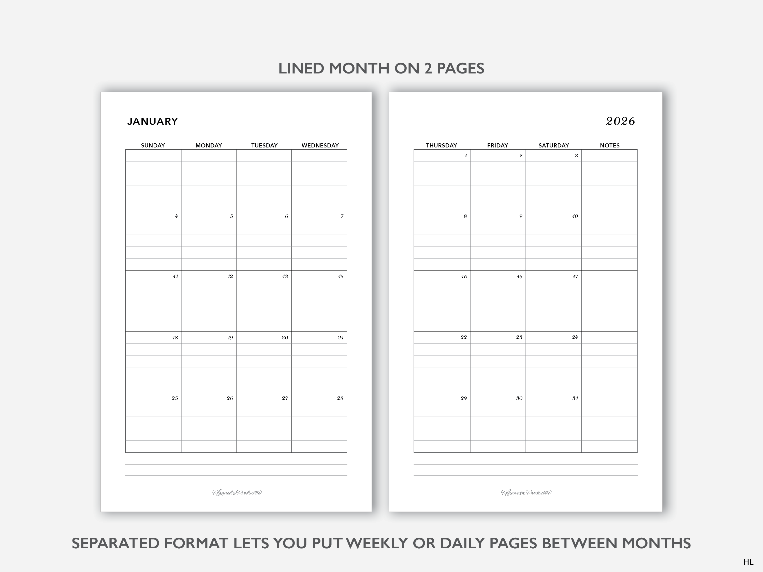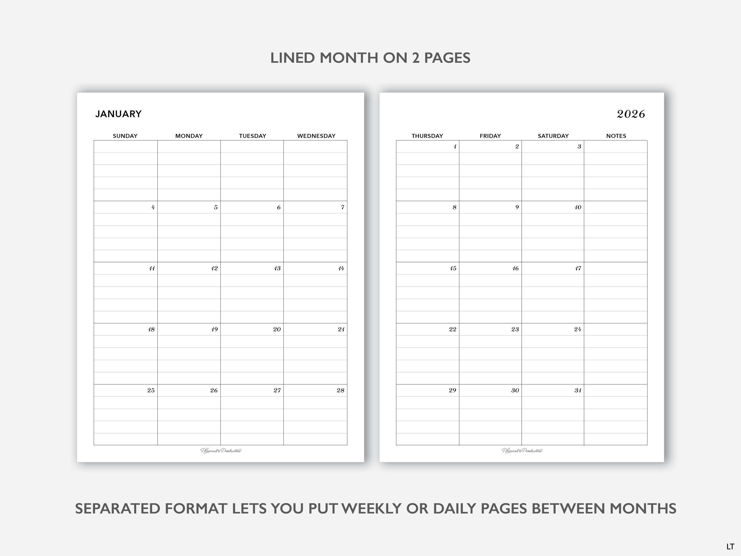 2026 Two Page Lined Monthly Calendar - Separated Layout