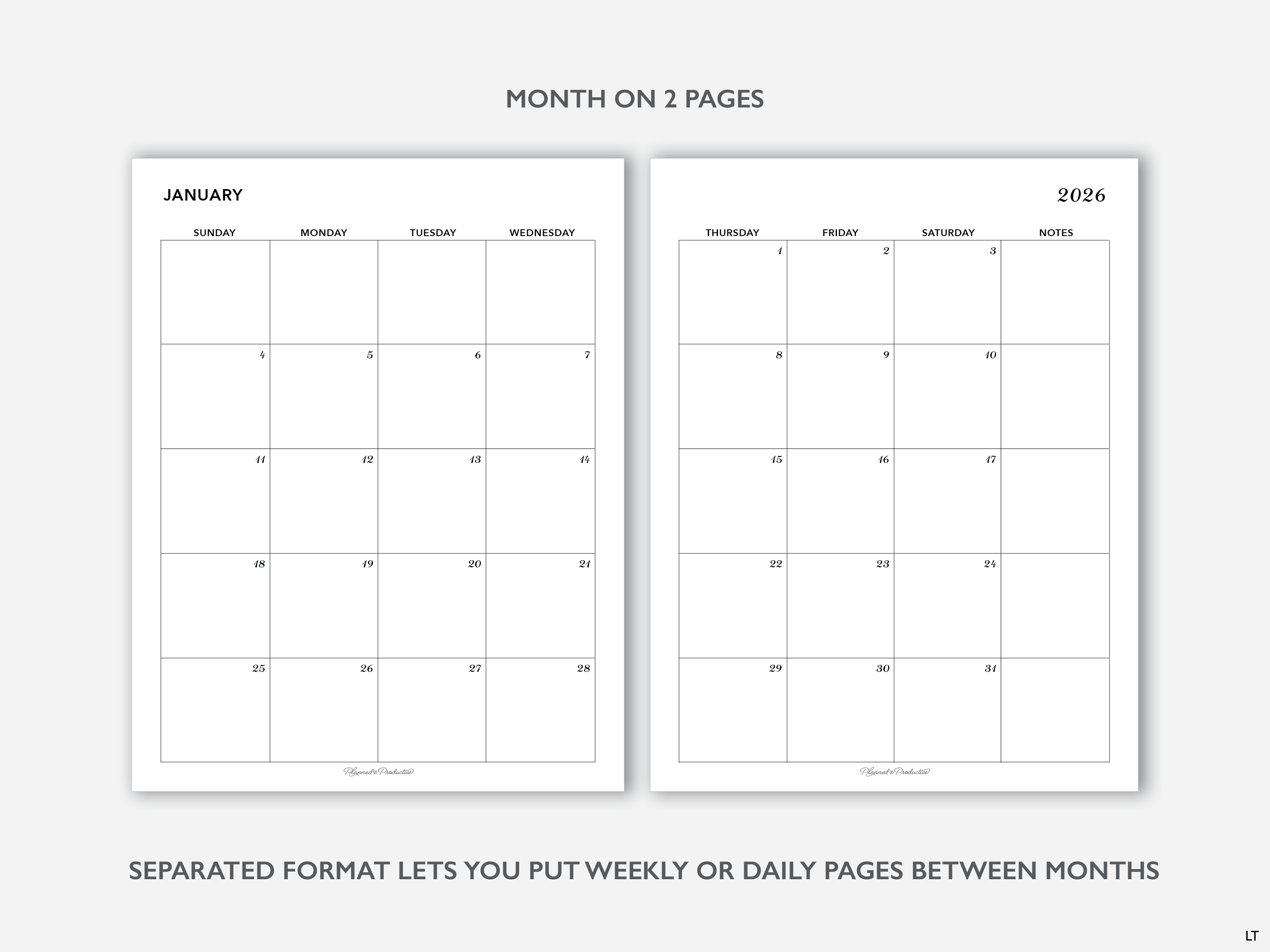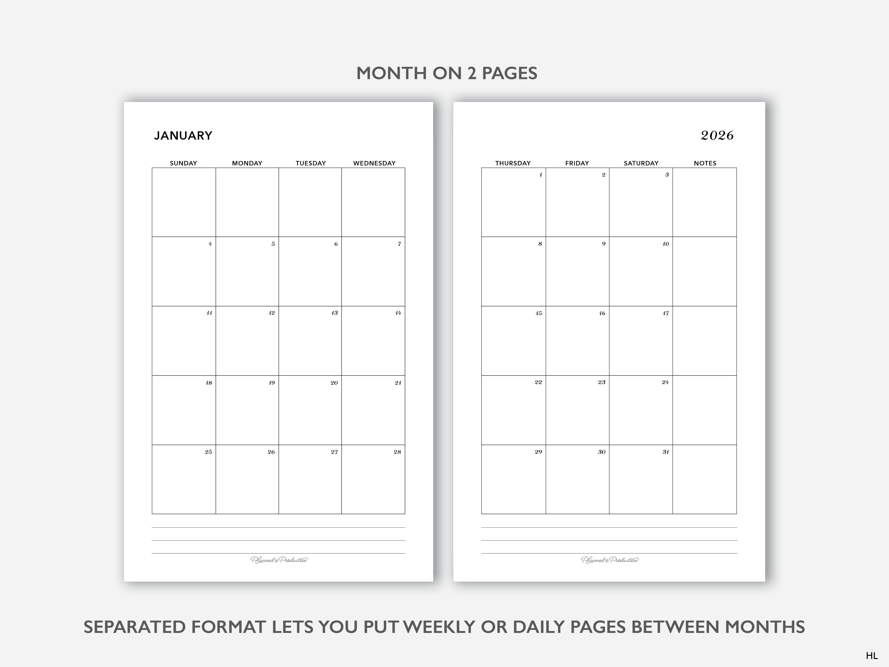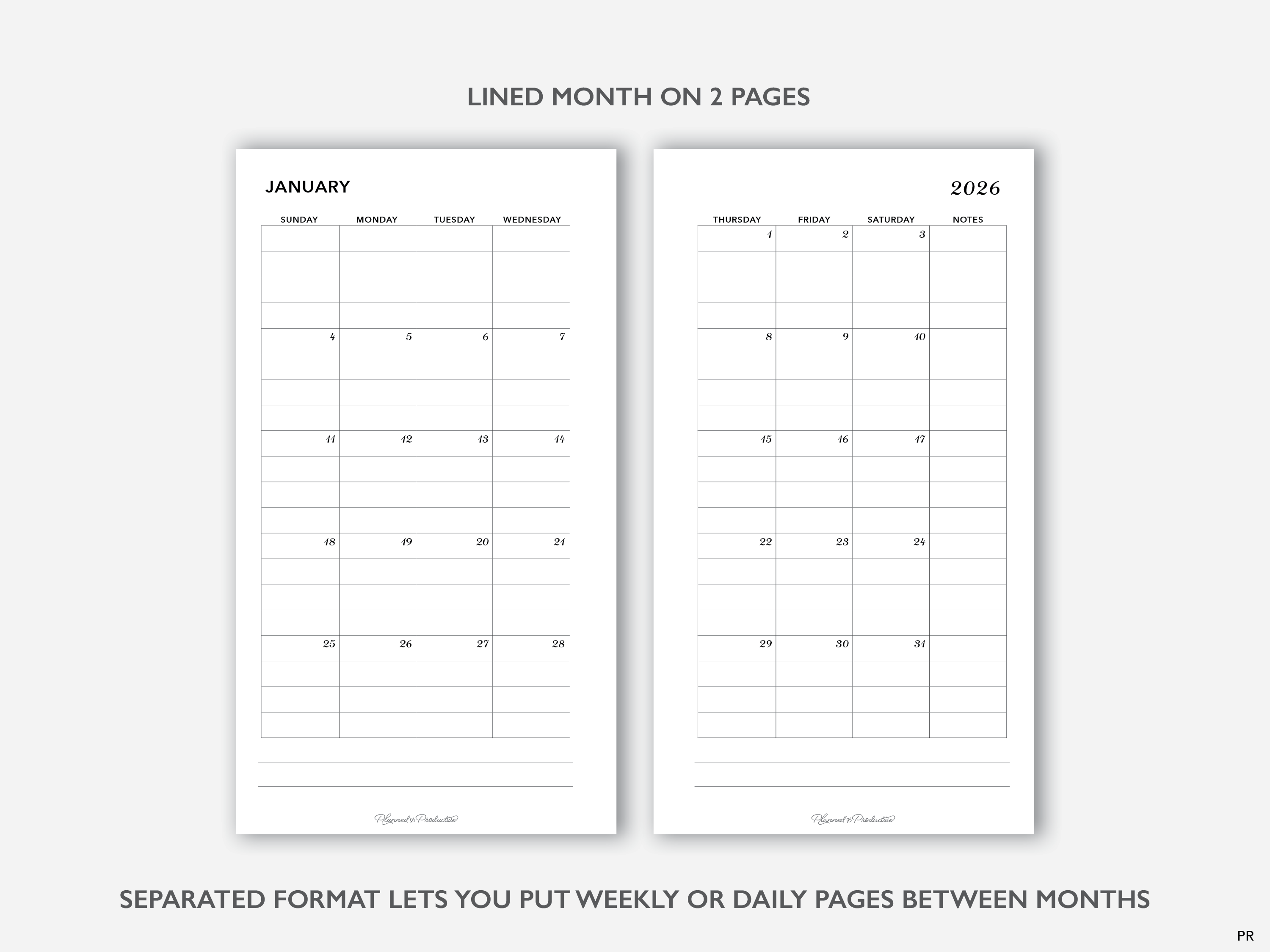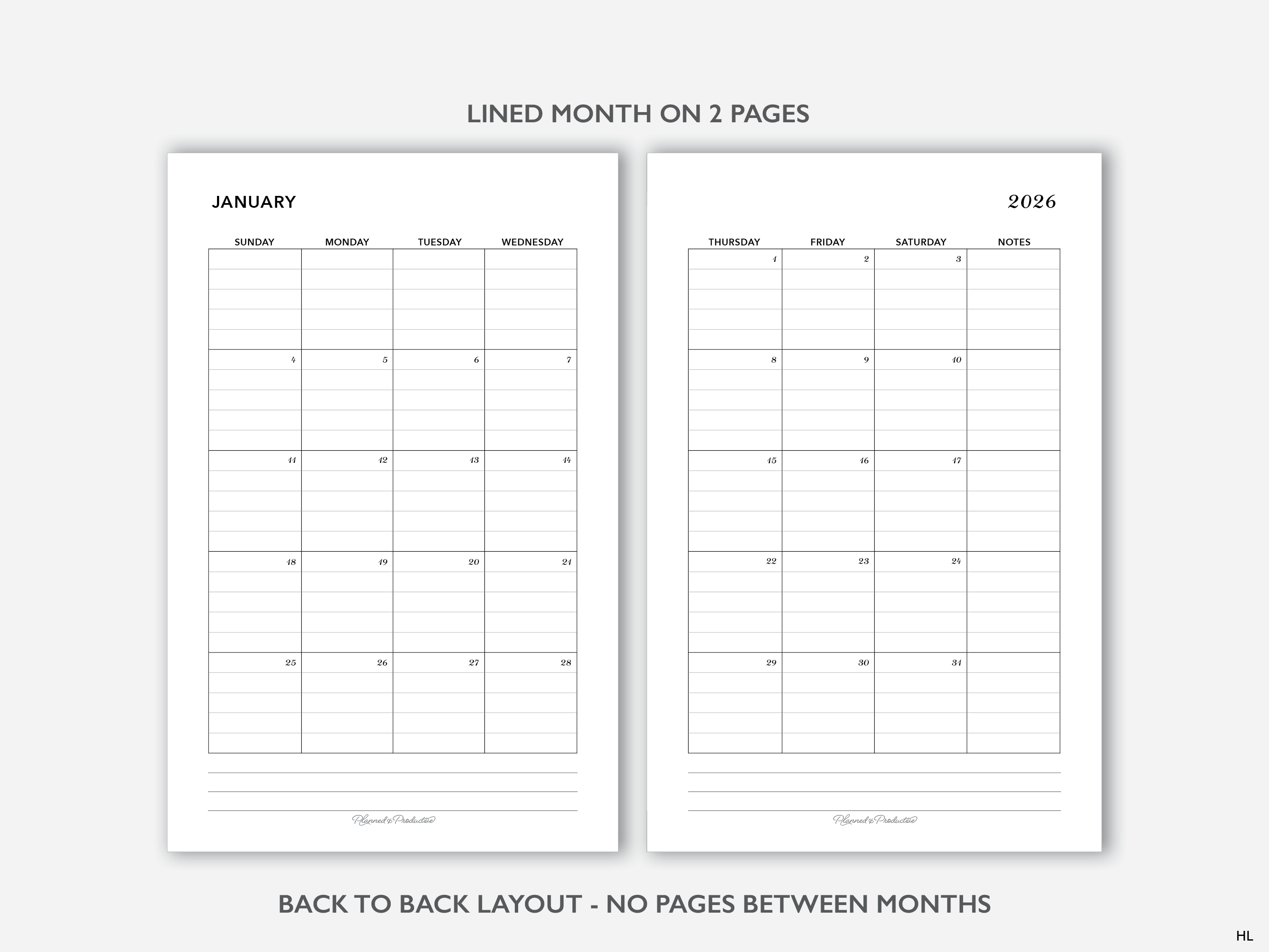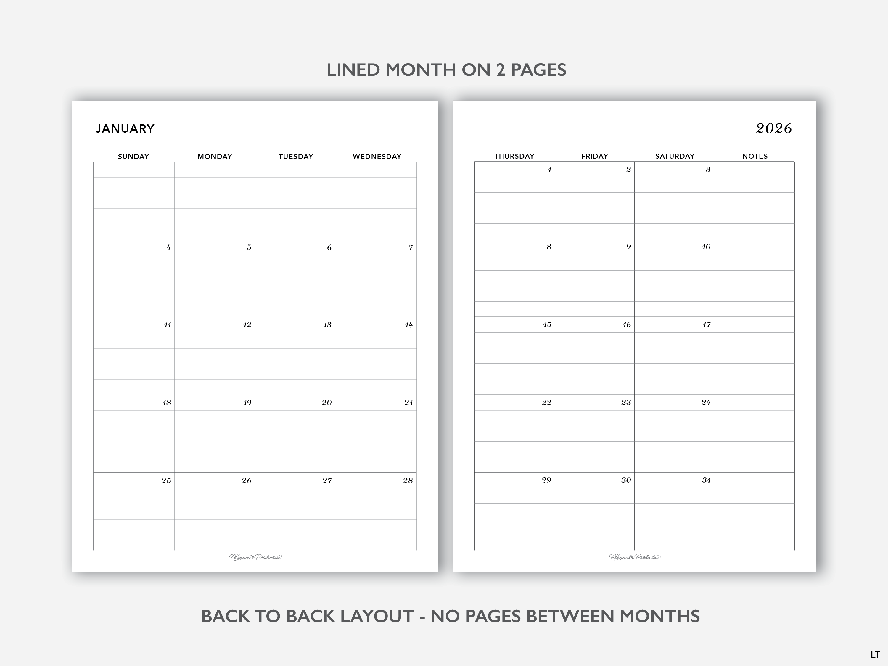 2026 Two Page Lined Monthly Calendar - Separated Layout