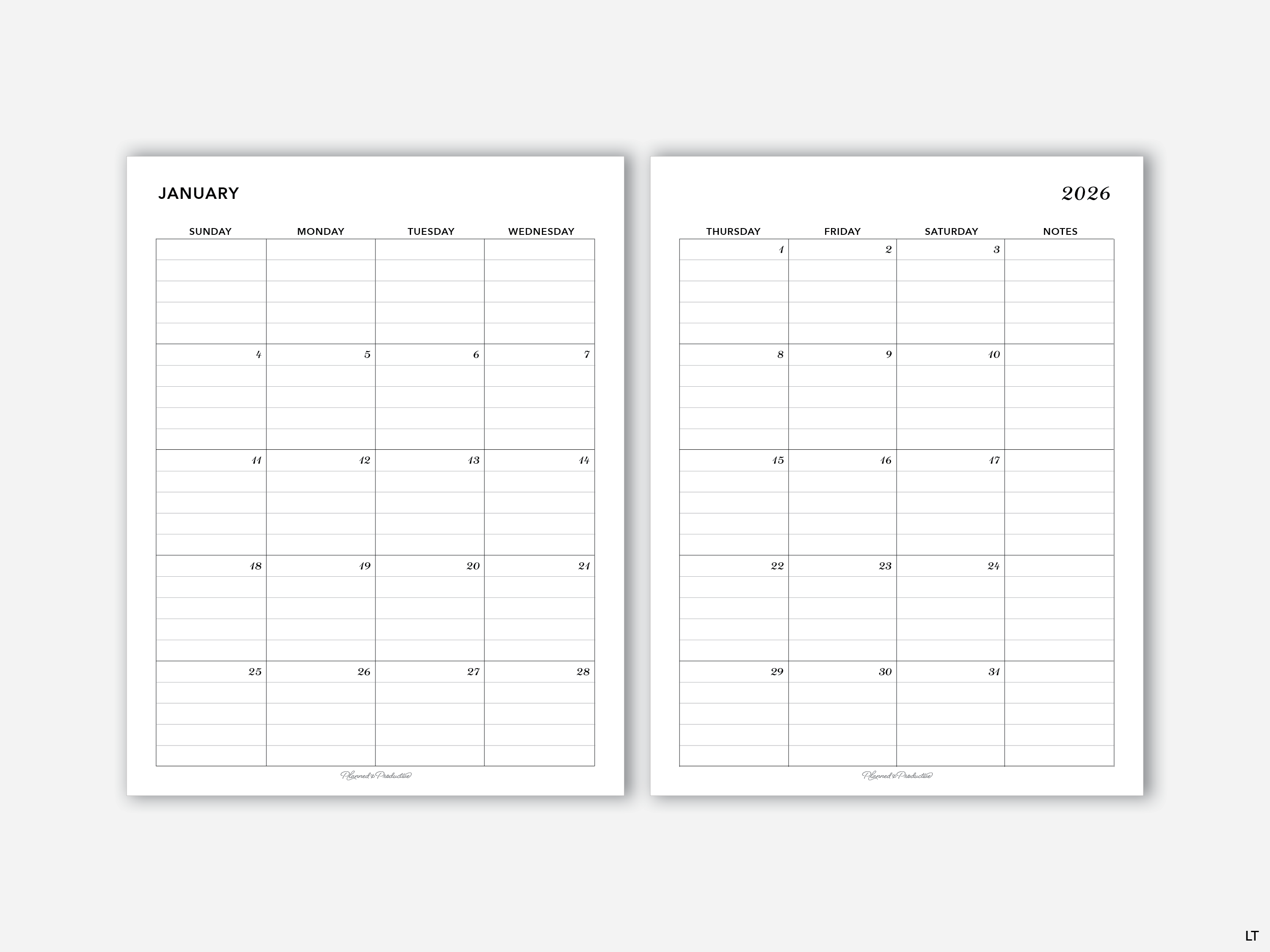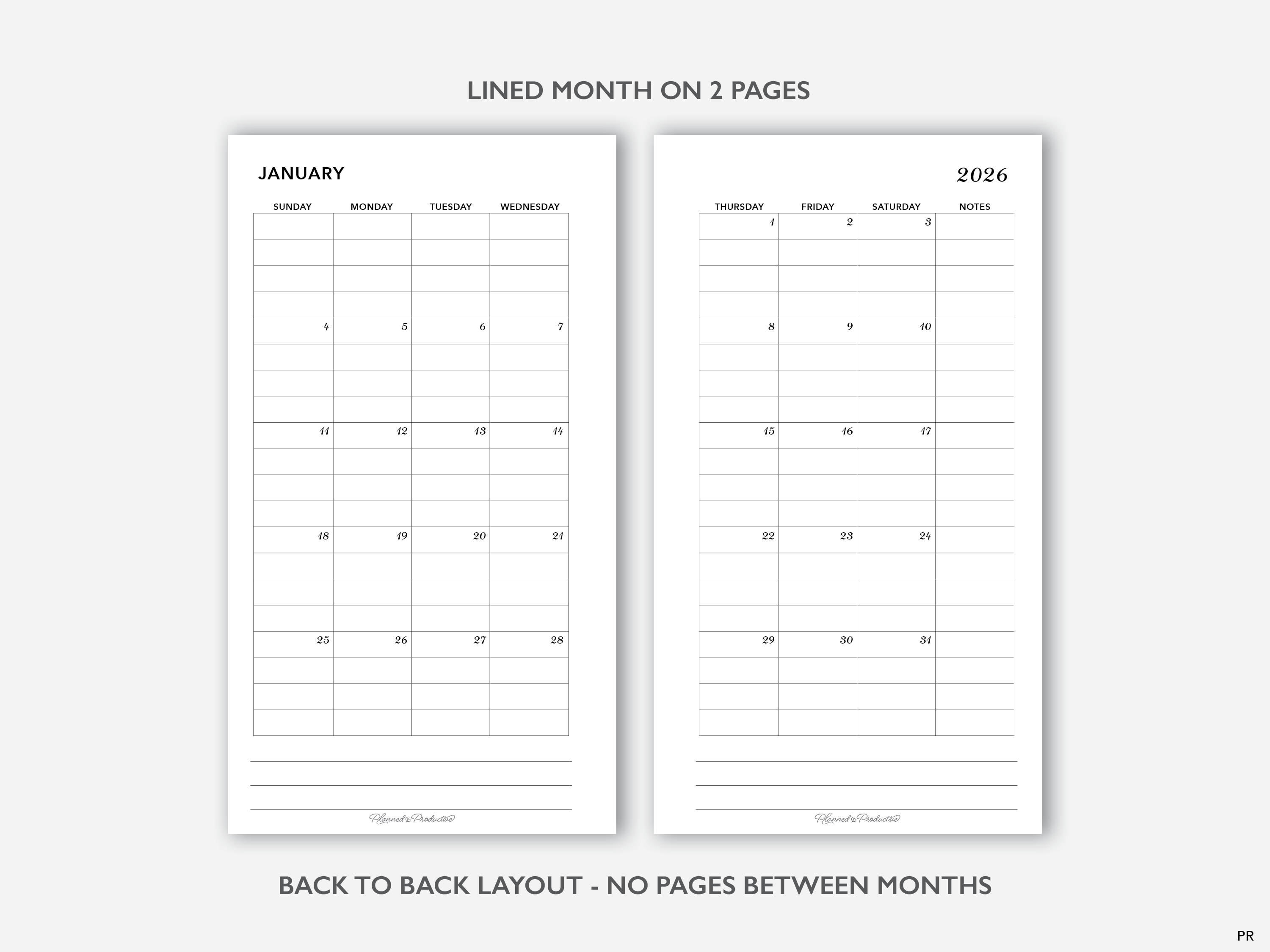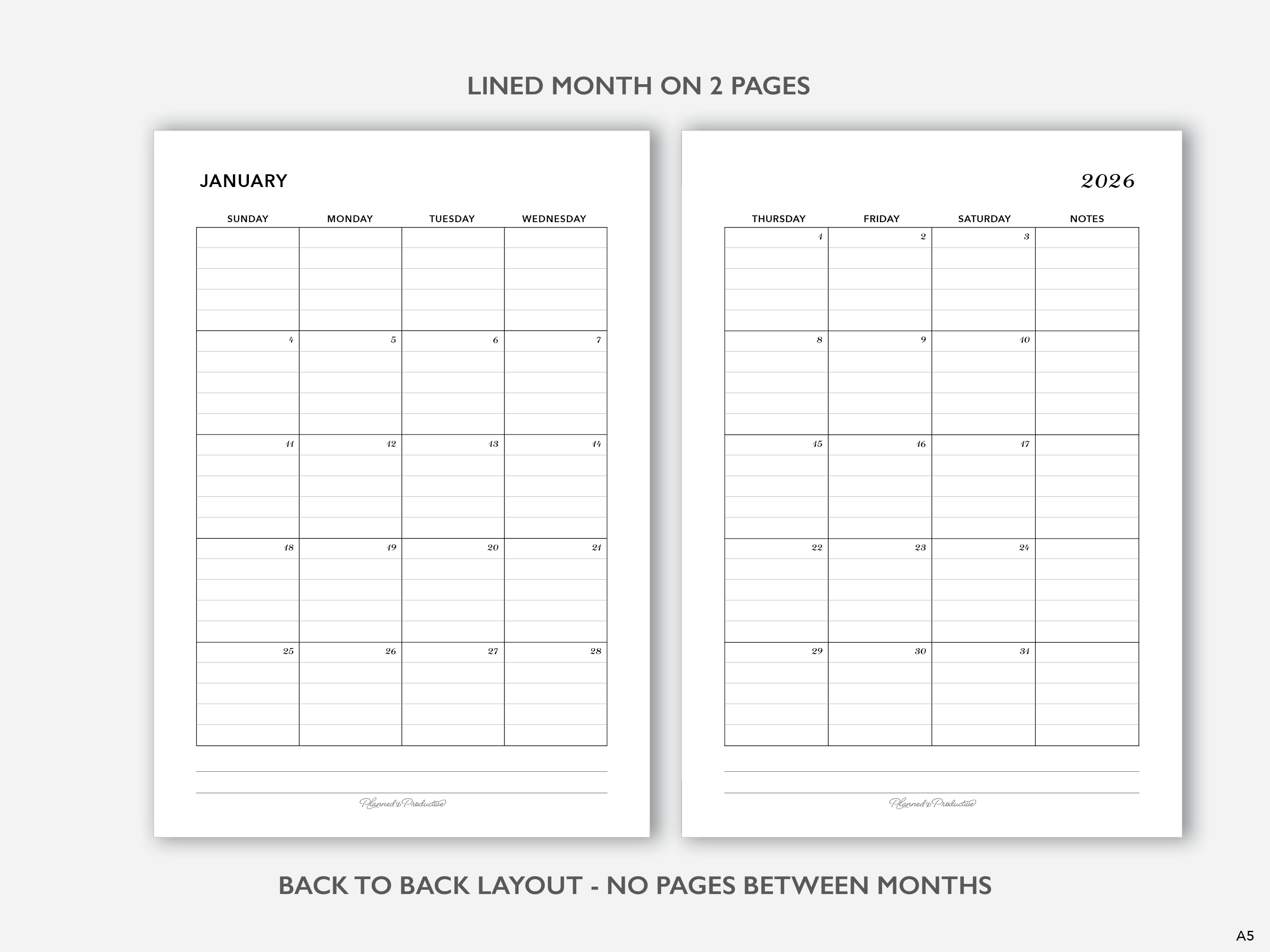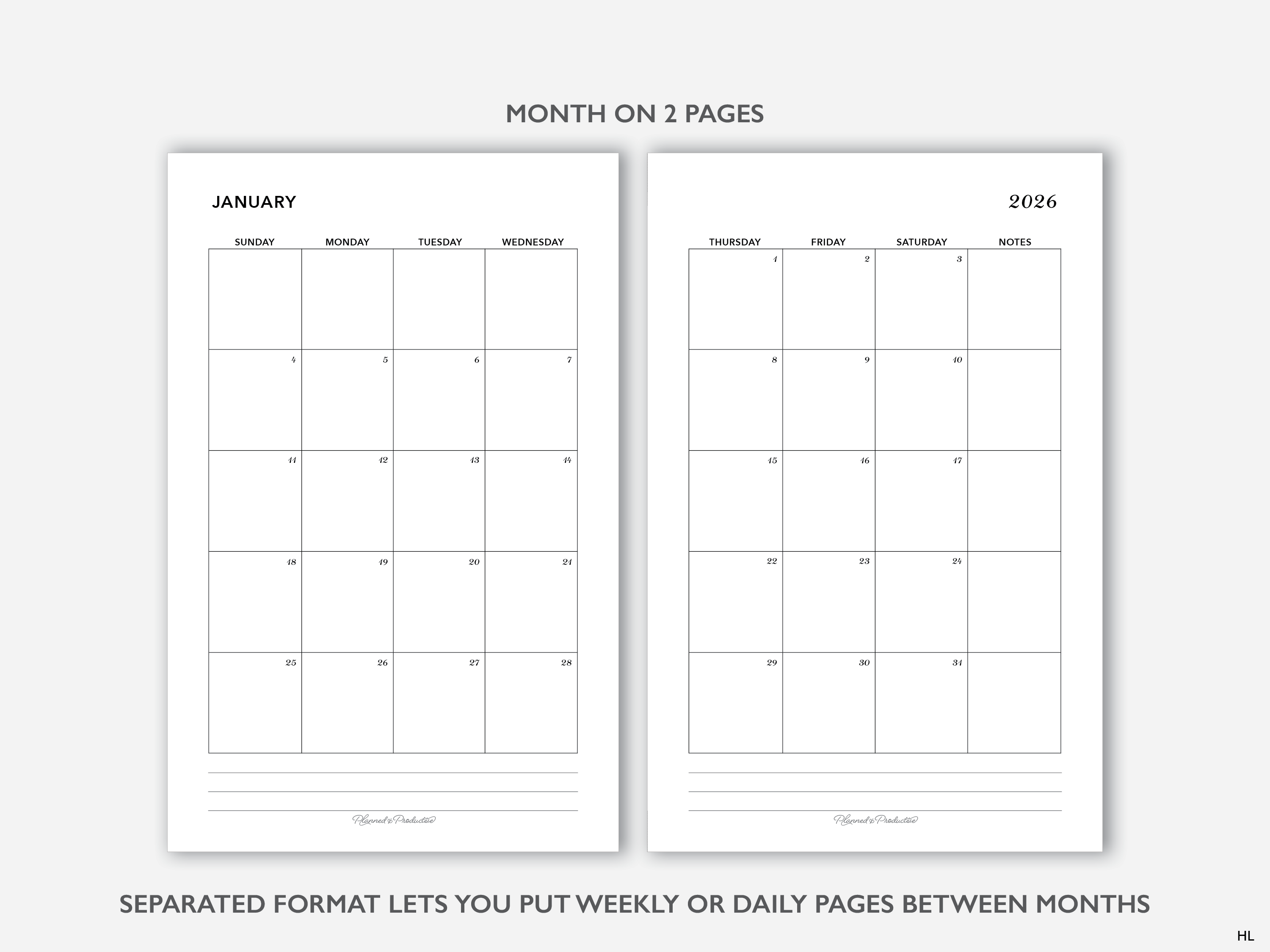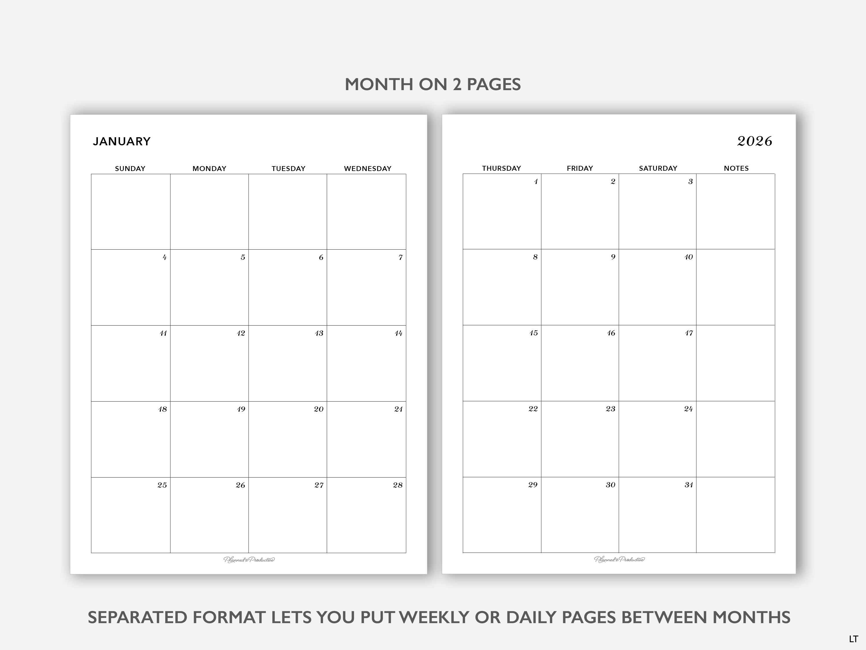 2026 Two Page Lined Monthly Calendar - Separated Layout