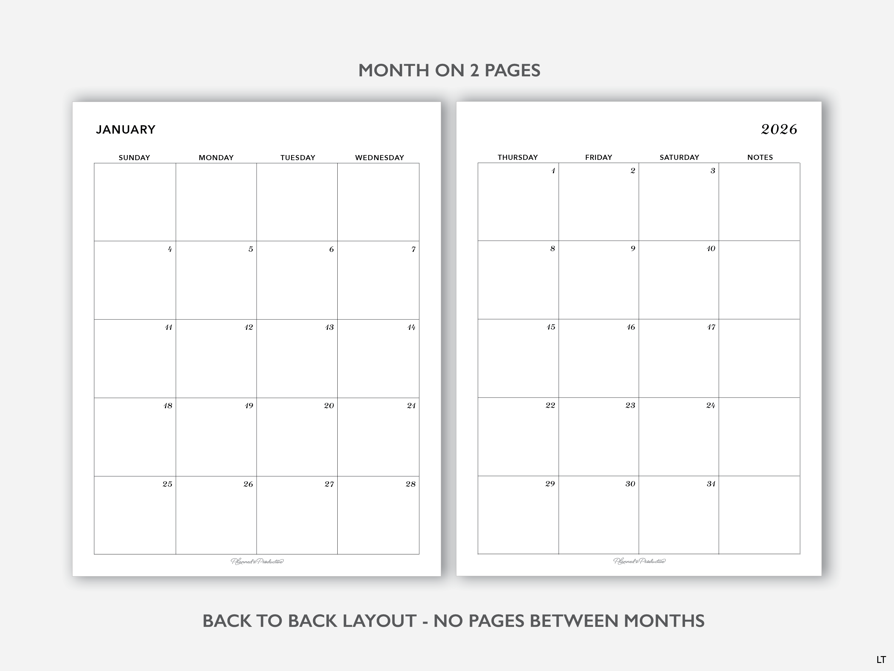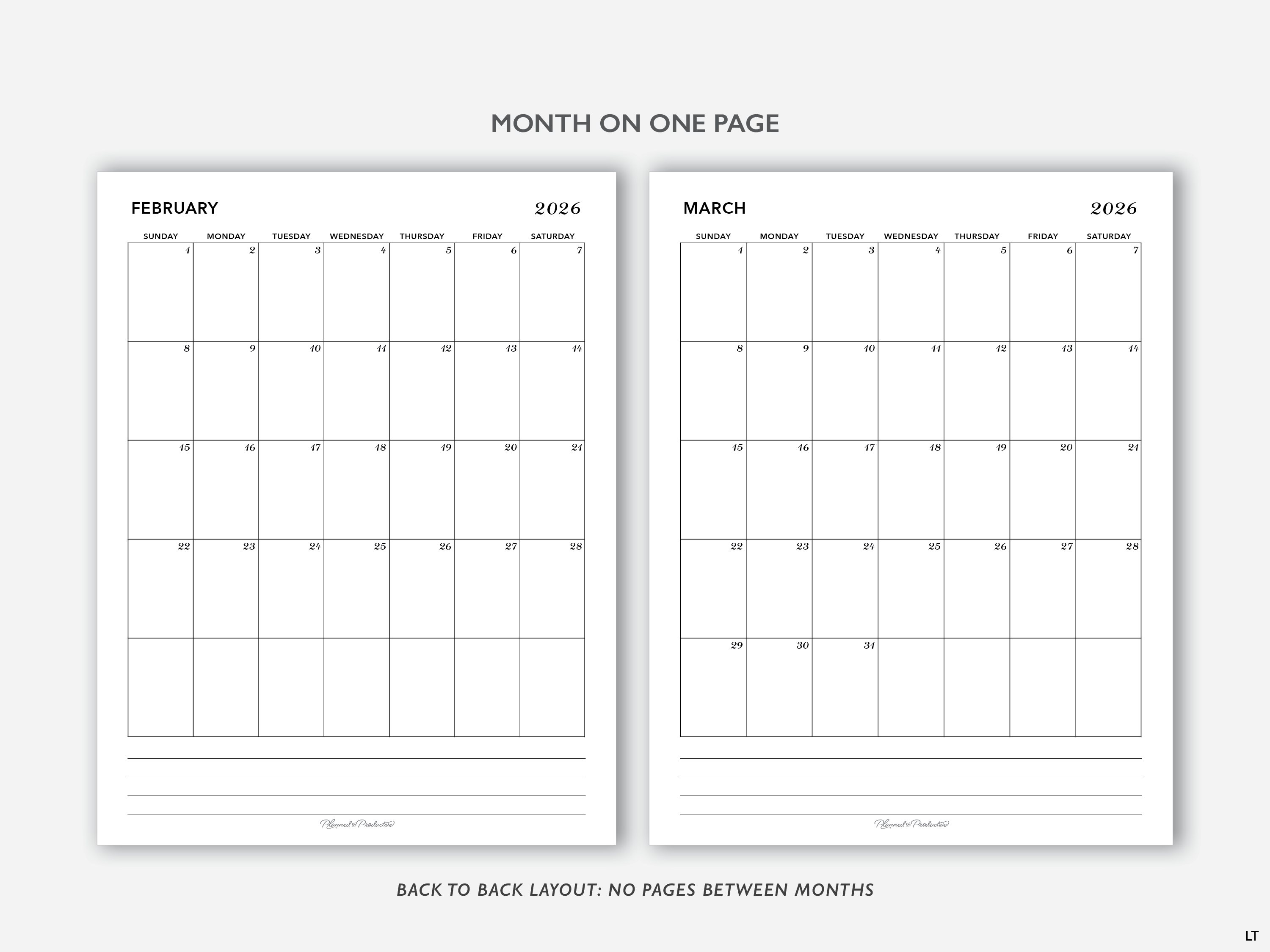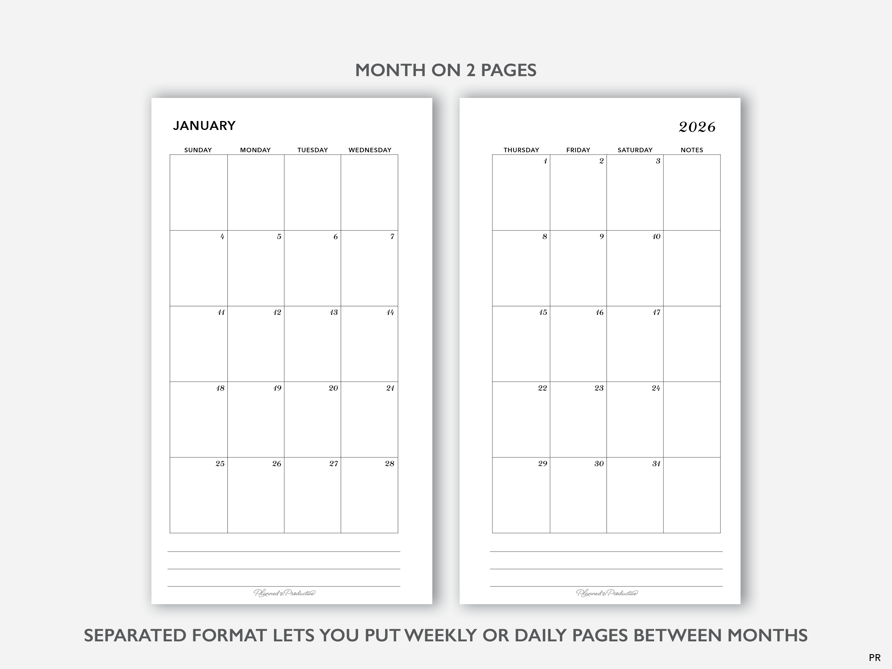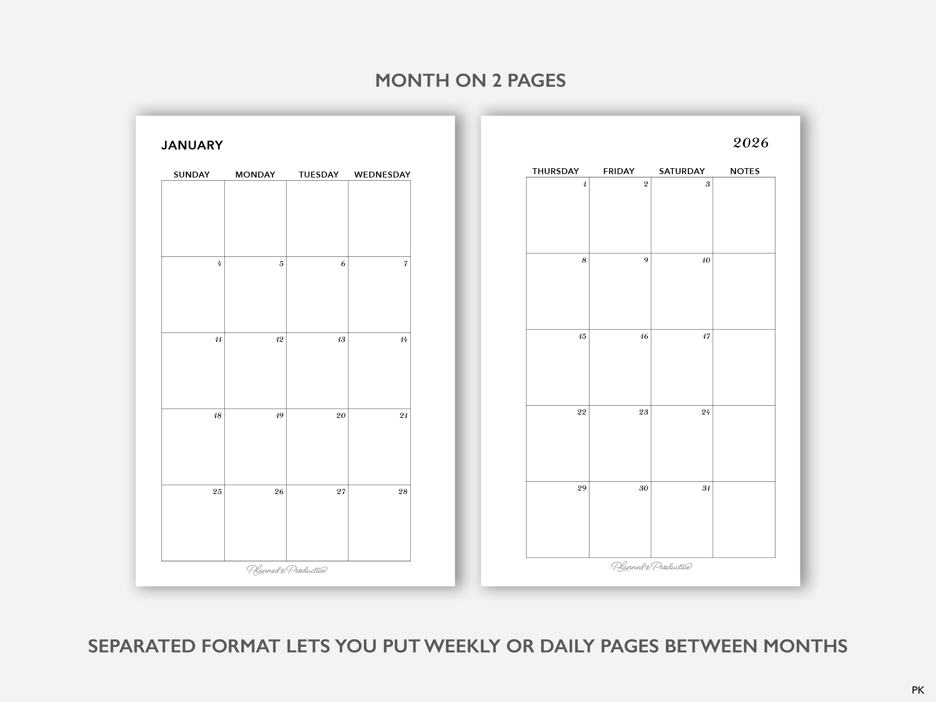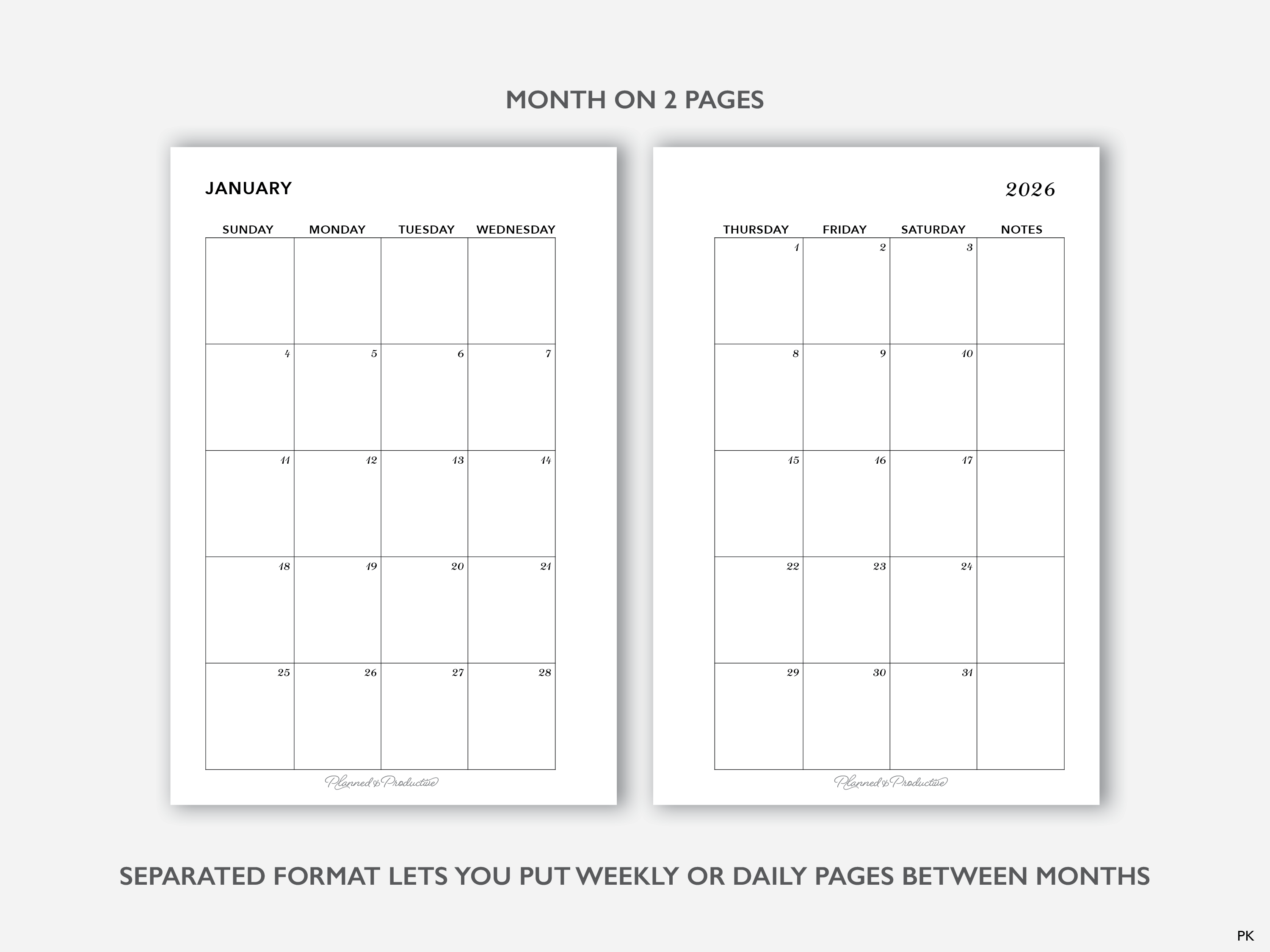 2026 Two Page Lined Monthly Calendar - Separated Layout