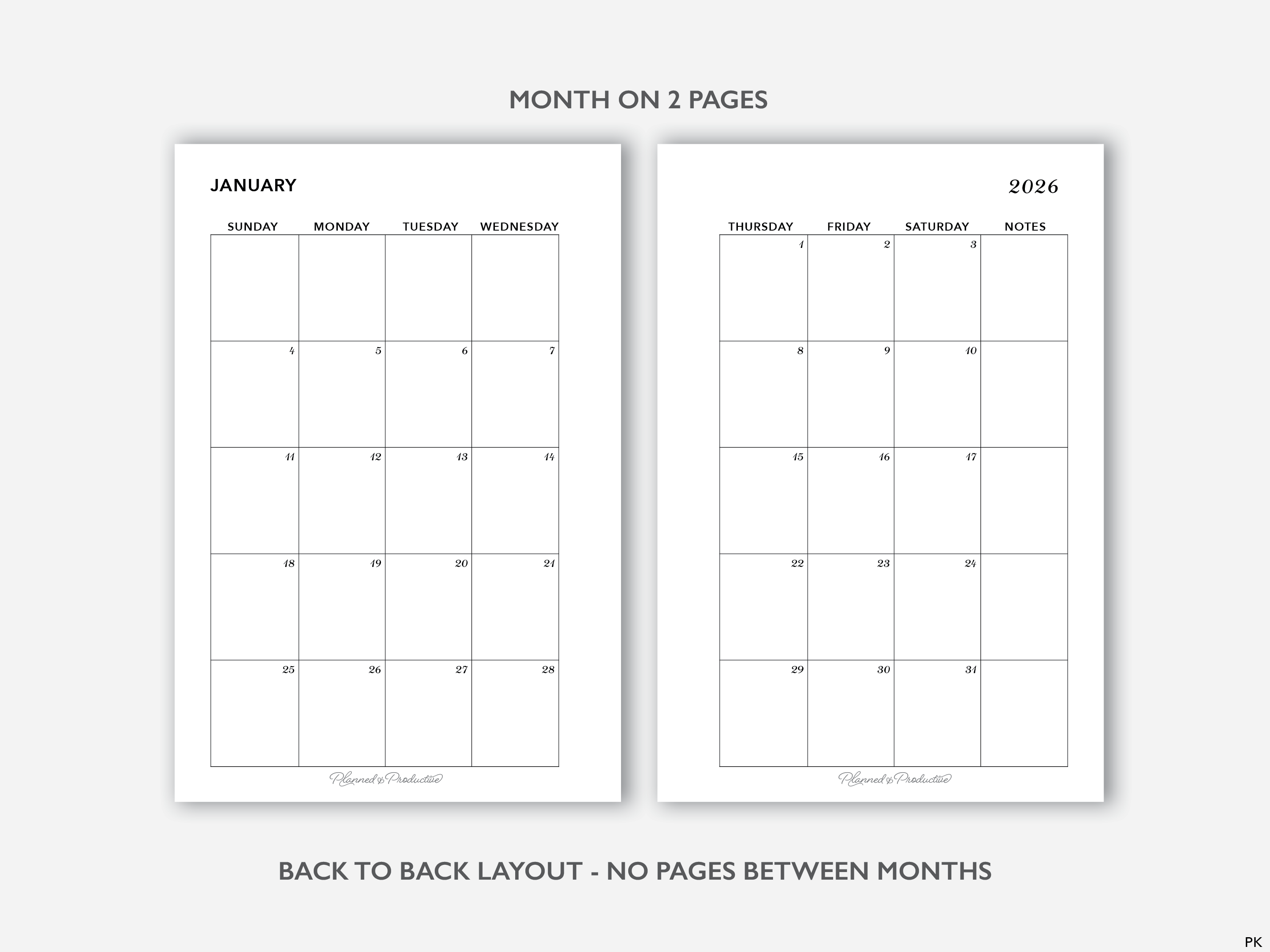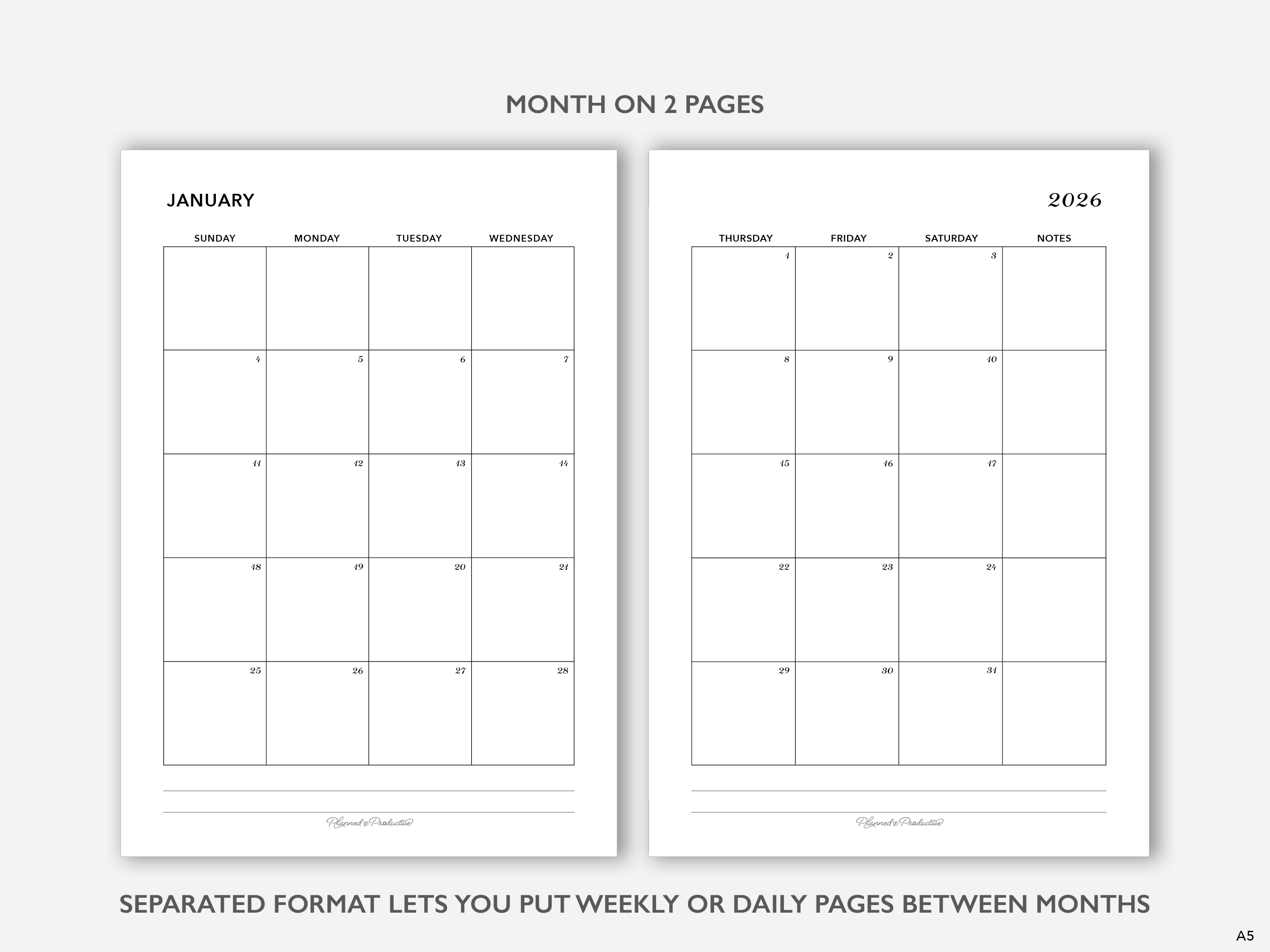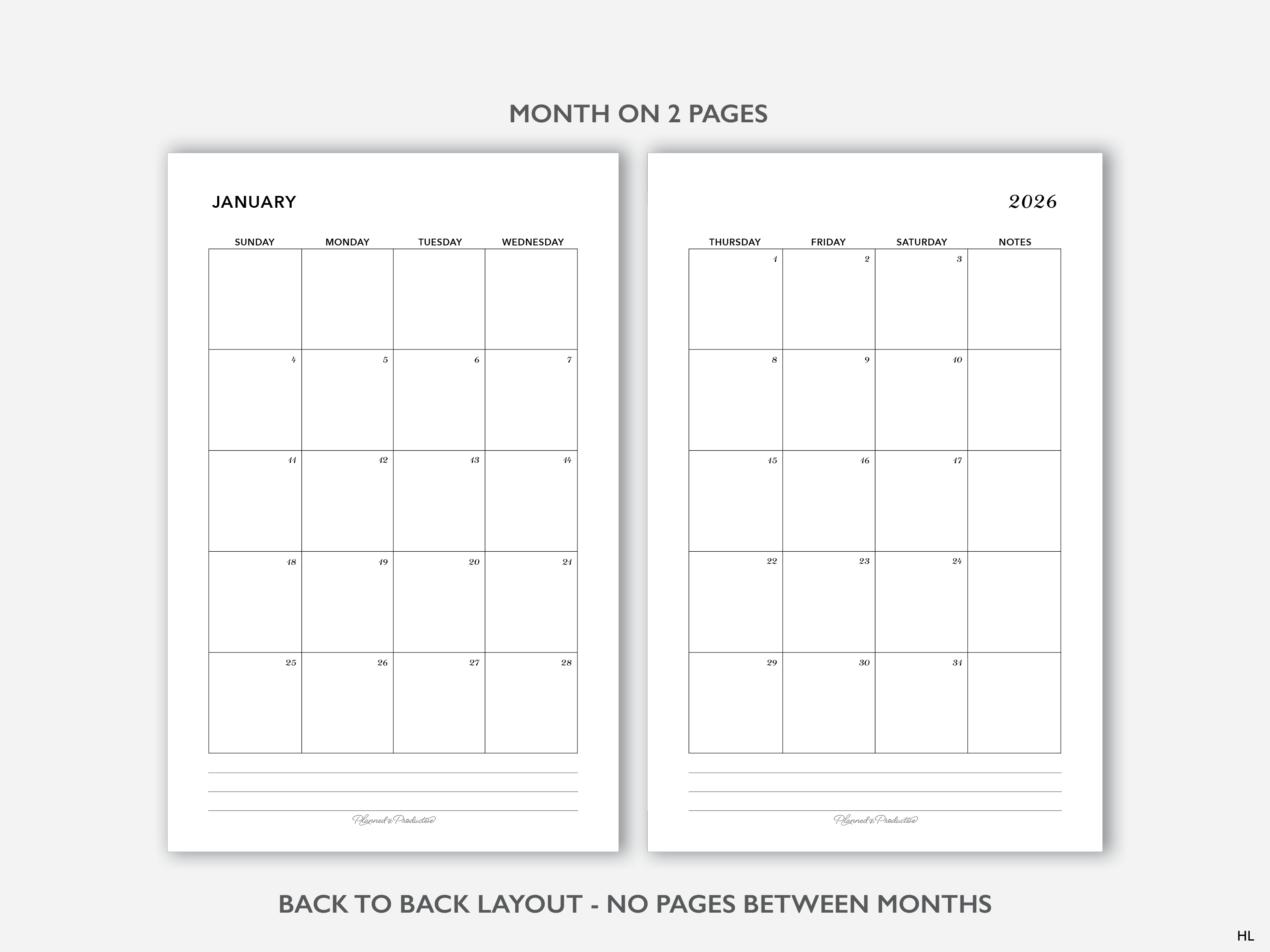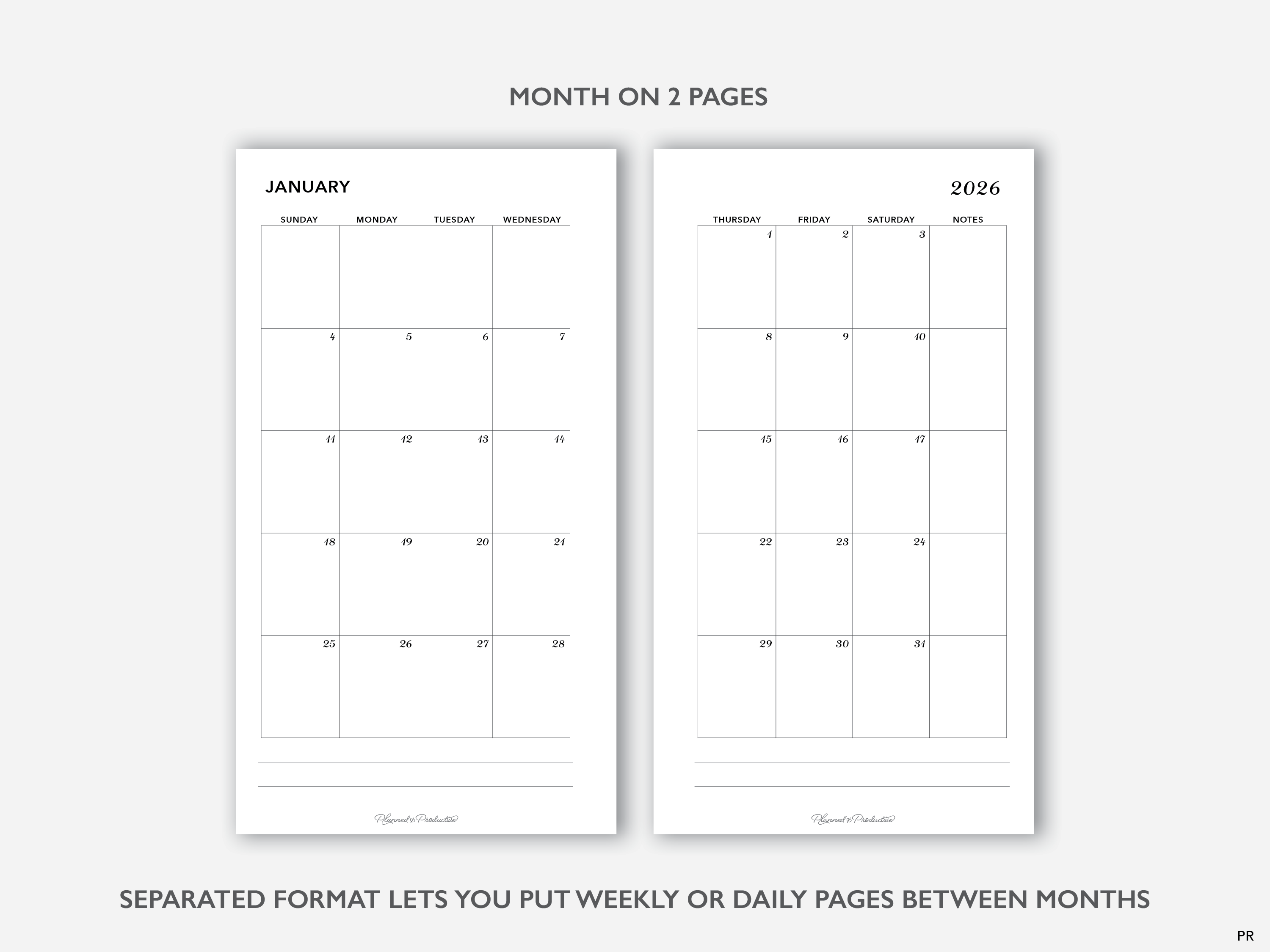 2026 Two Page Lined Monthly Calendar - Separated Layout