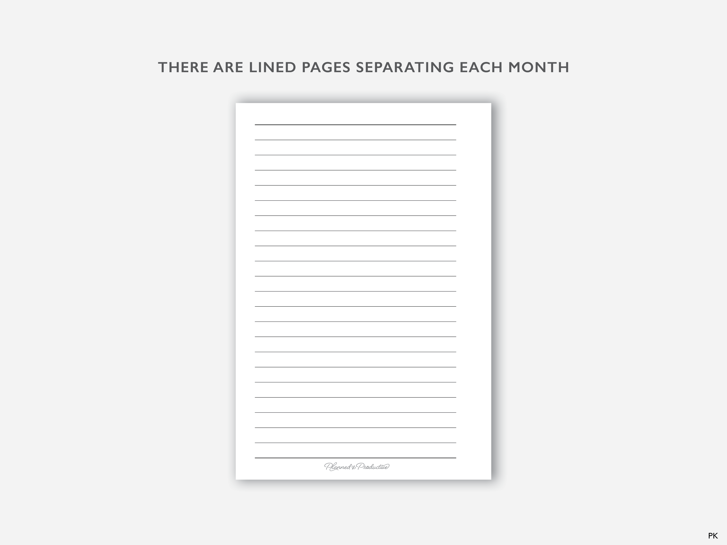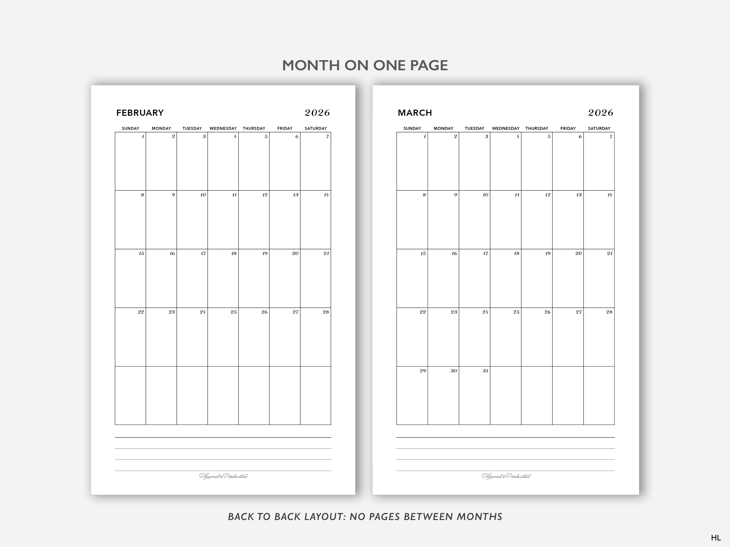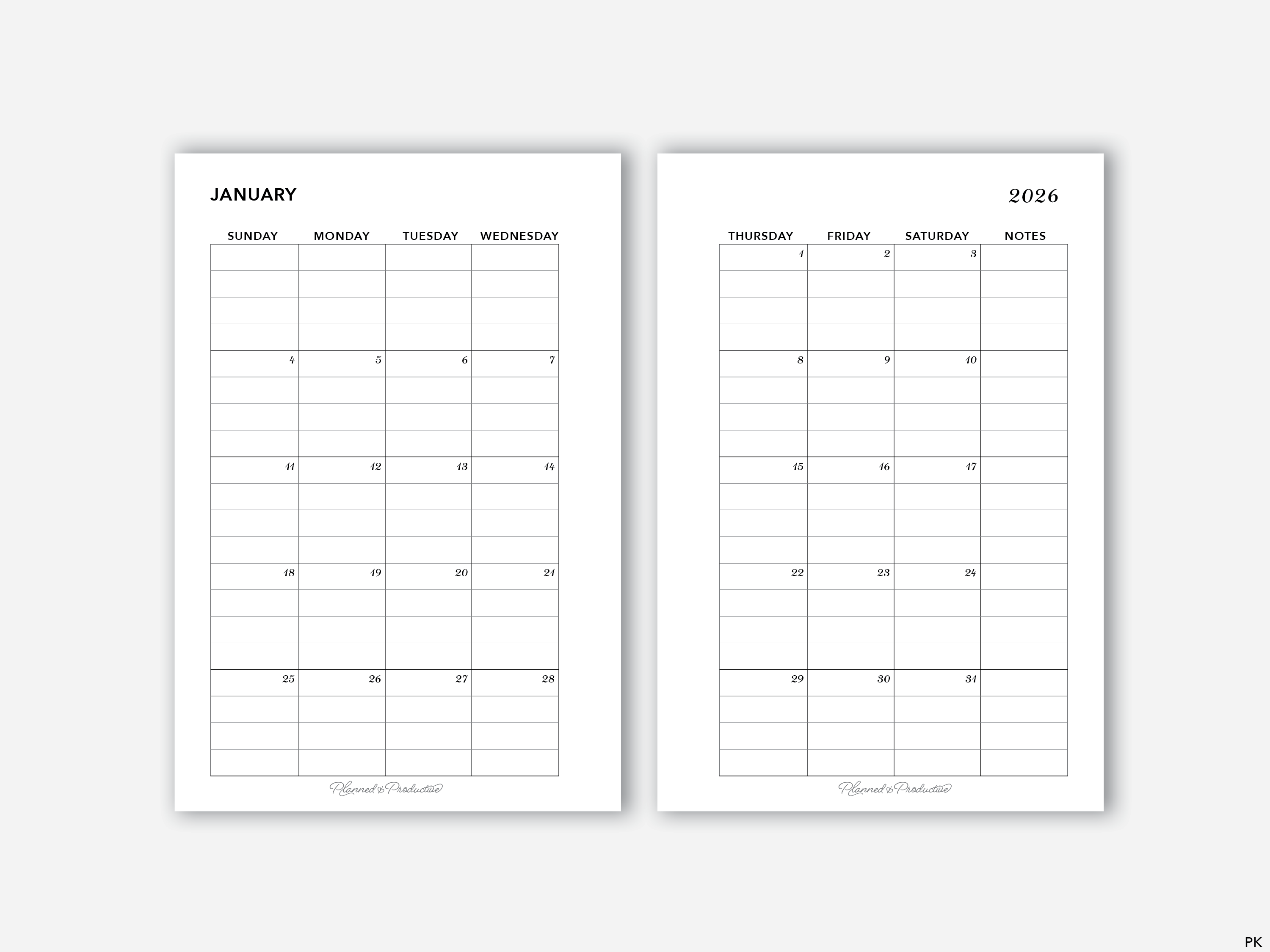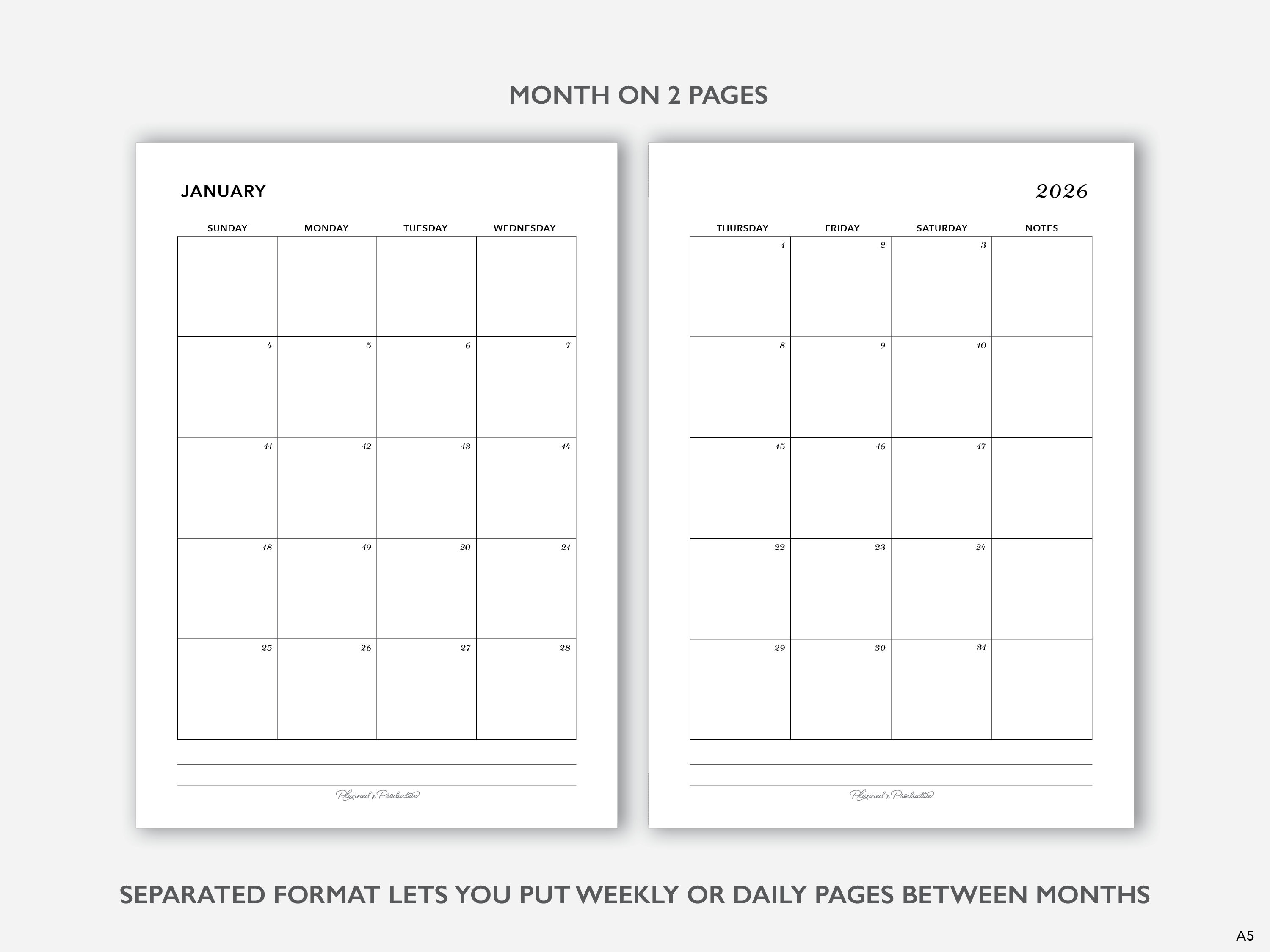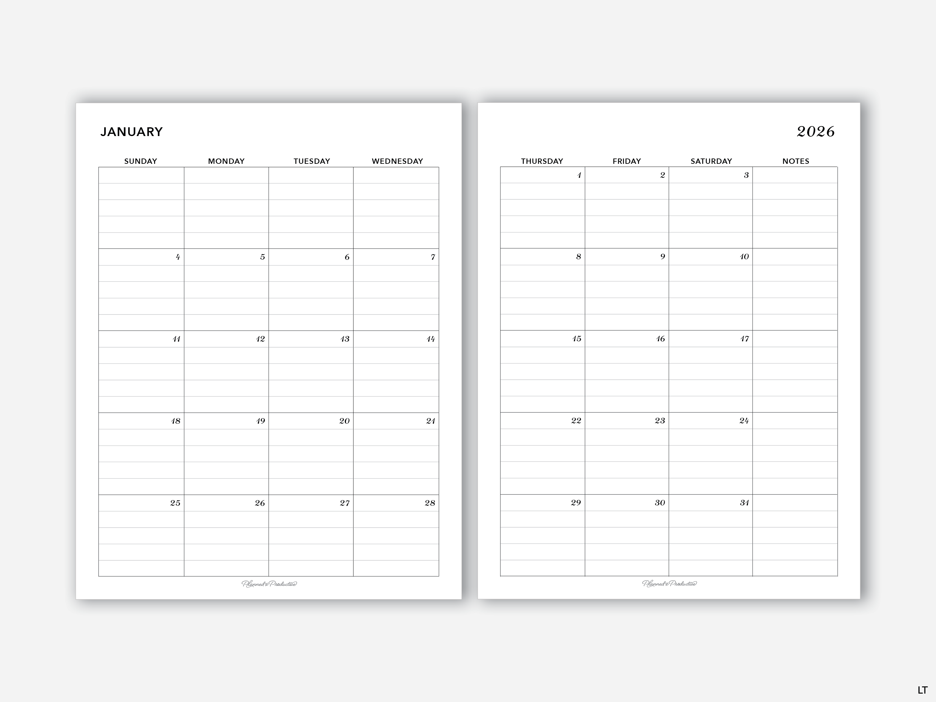 2026 Two Page Lined Monthly Calendar - Separated Layout