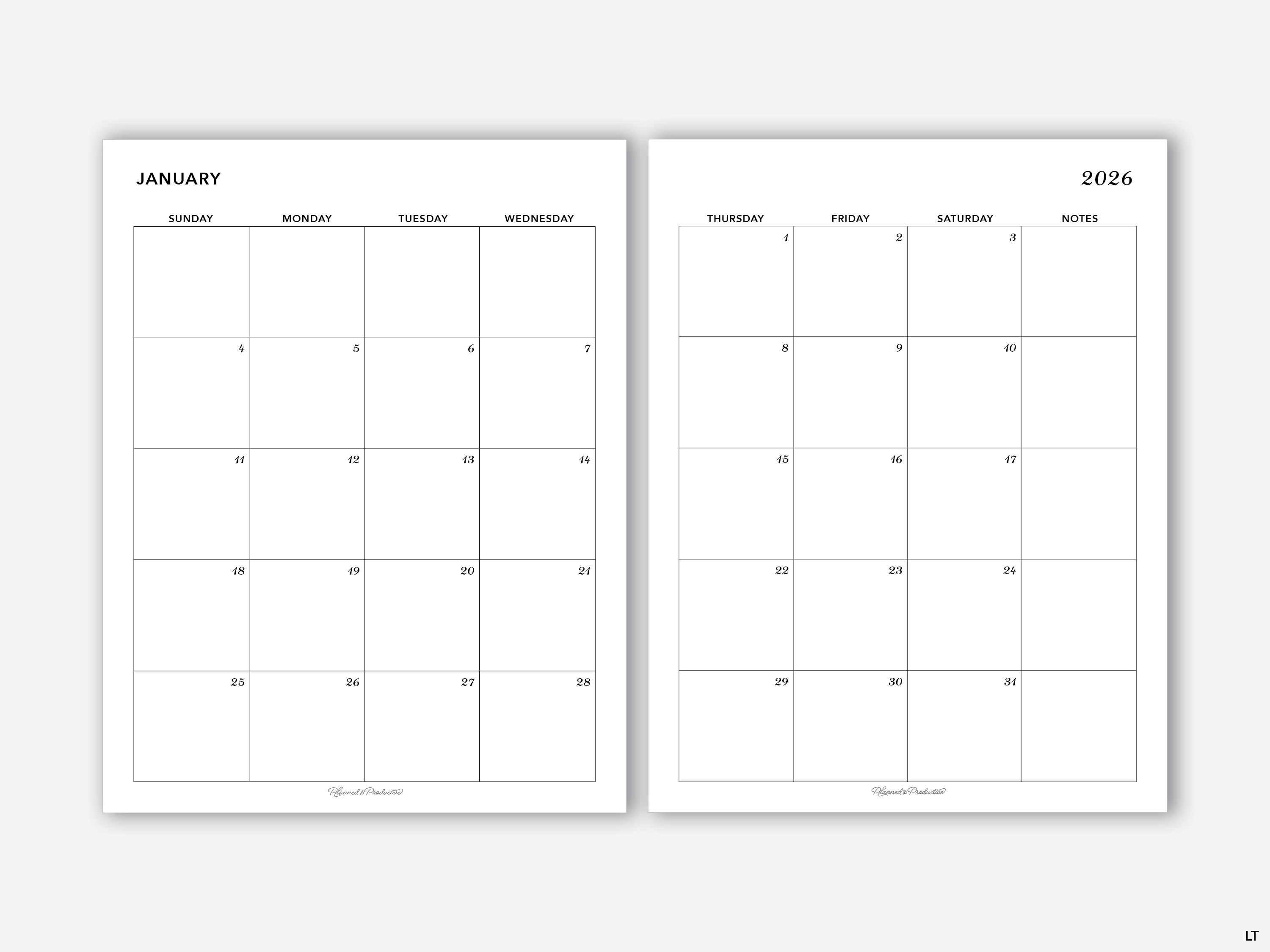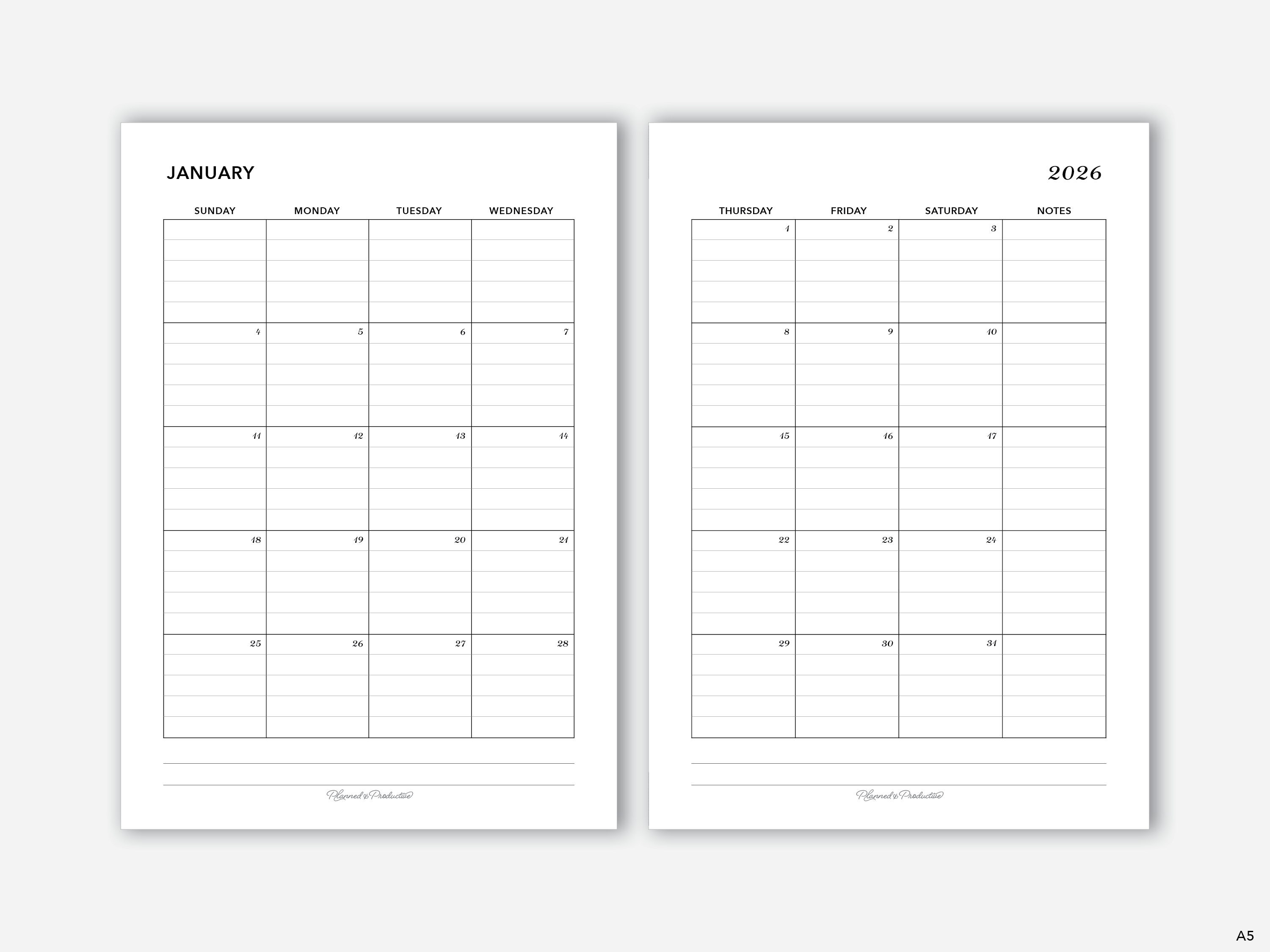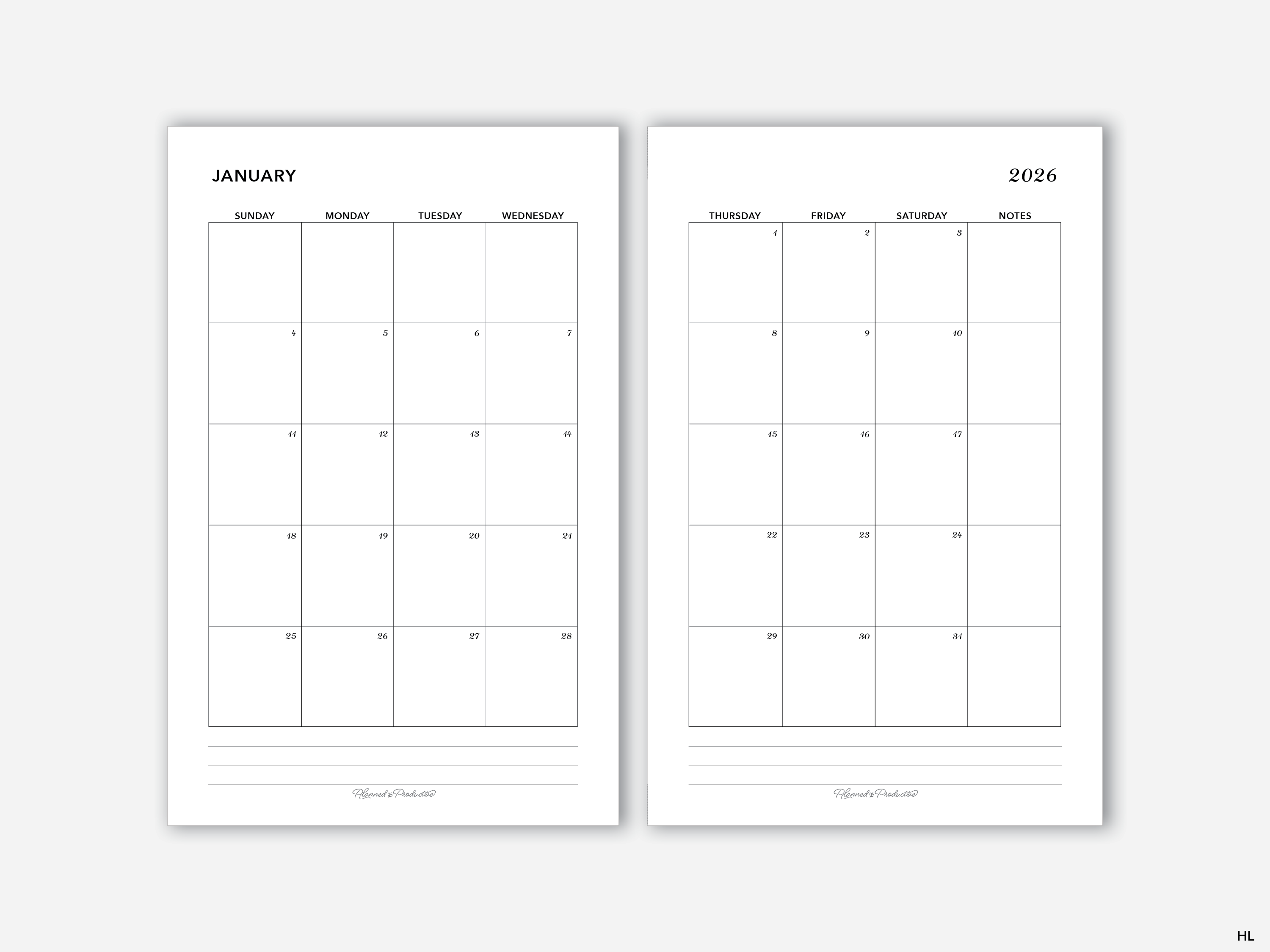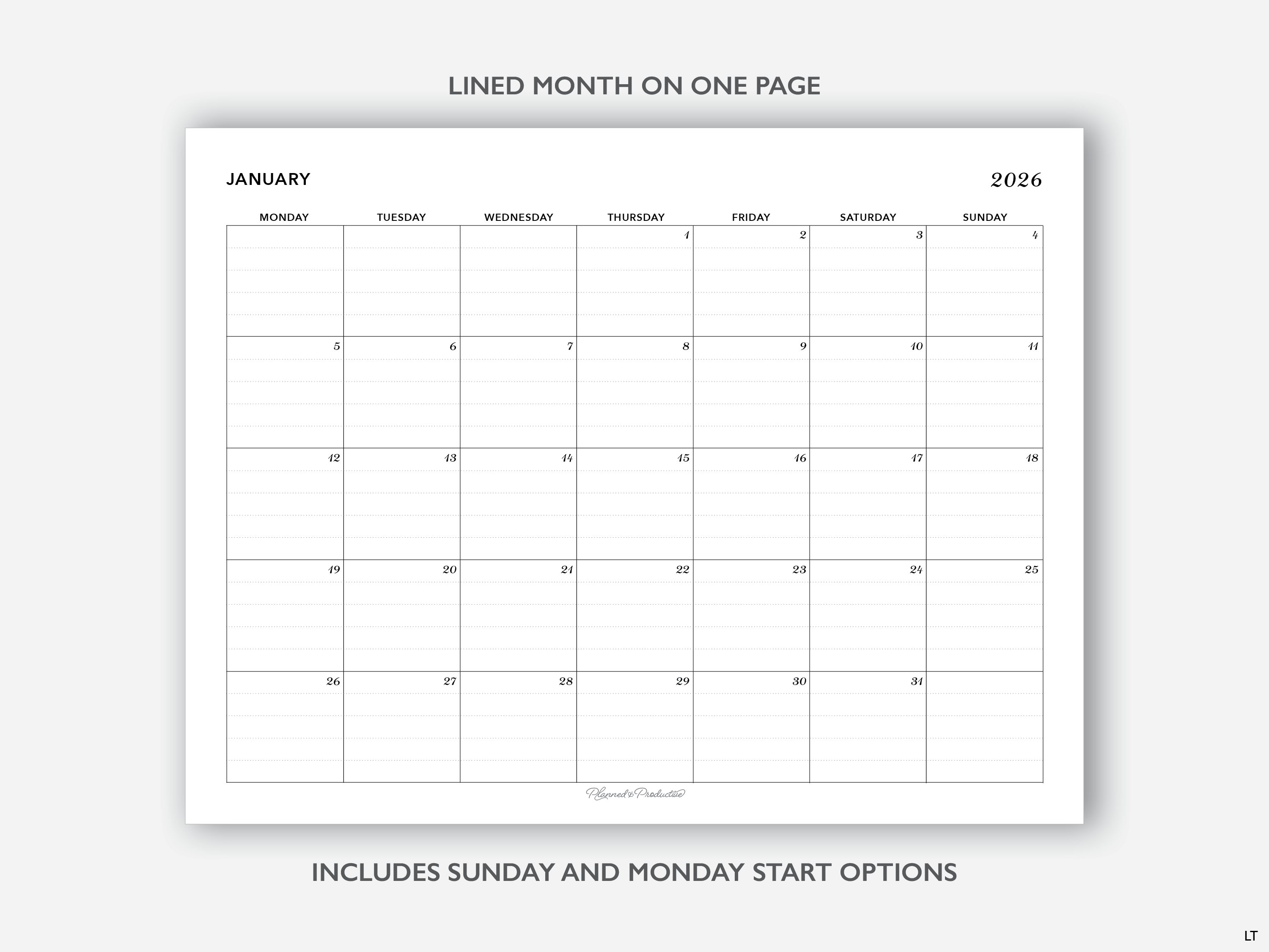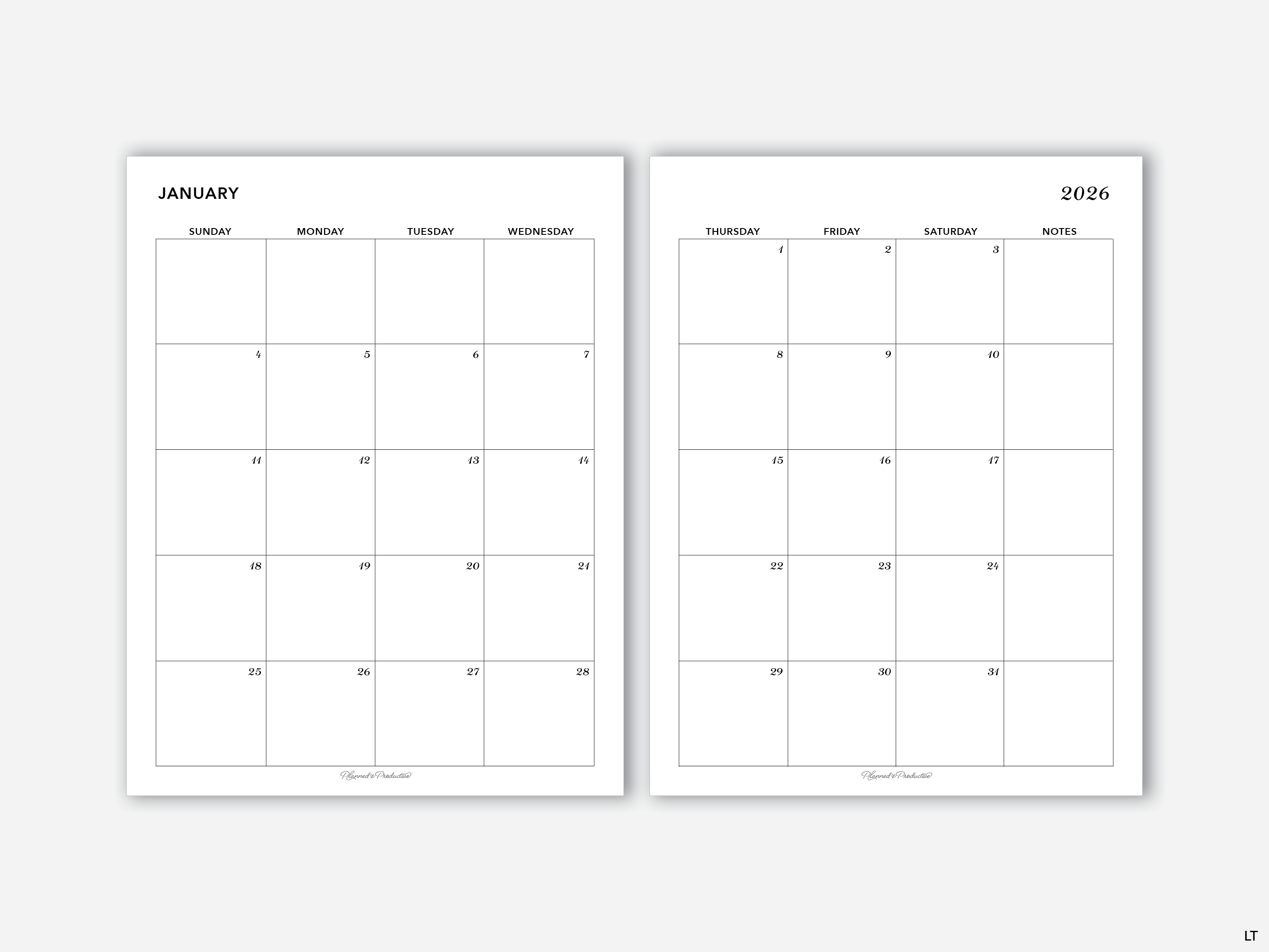 2026 Two Page Lined Monthly Calendar - Separated Layout
