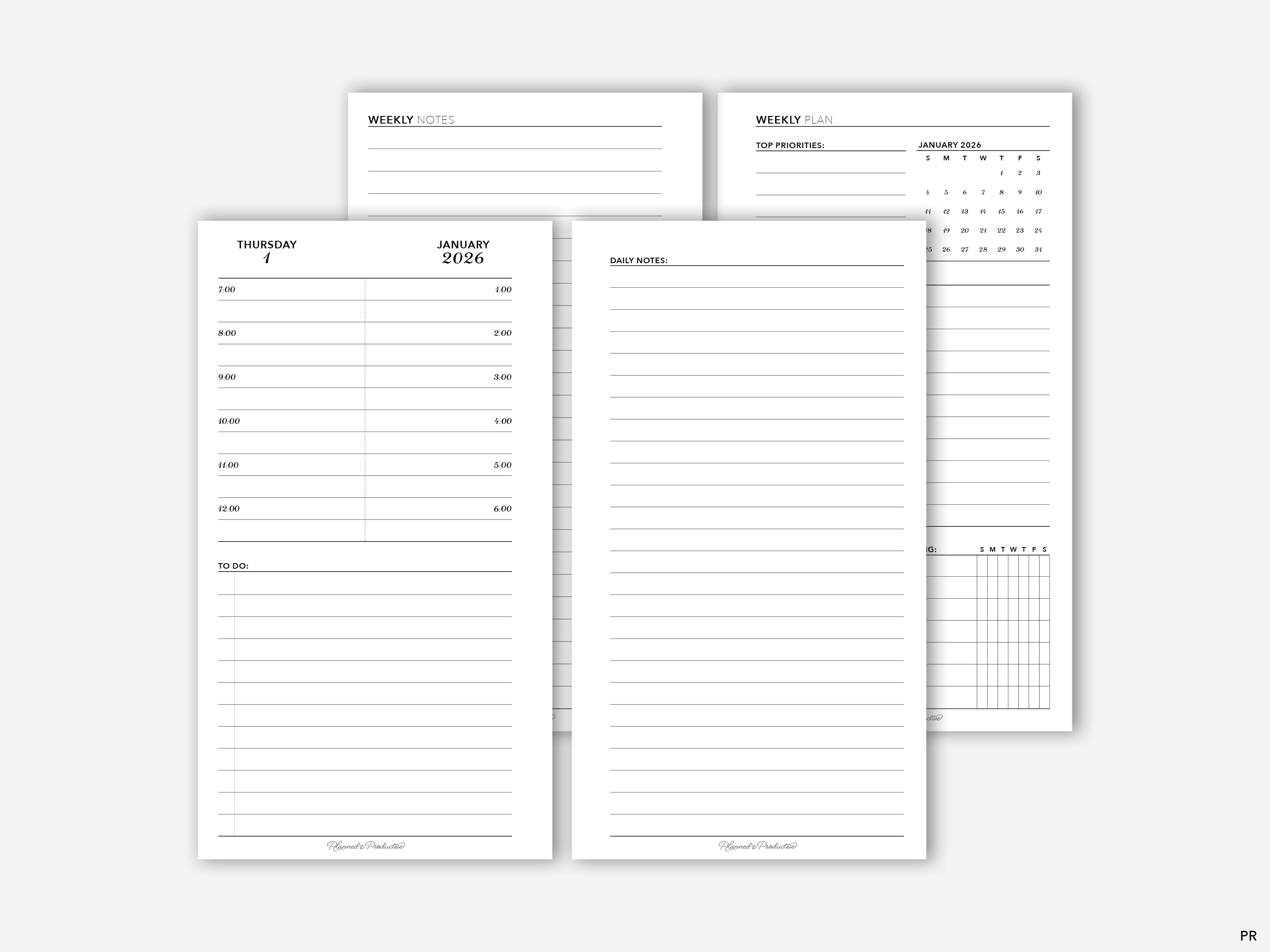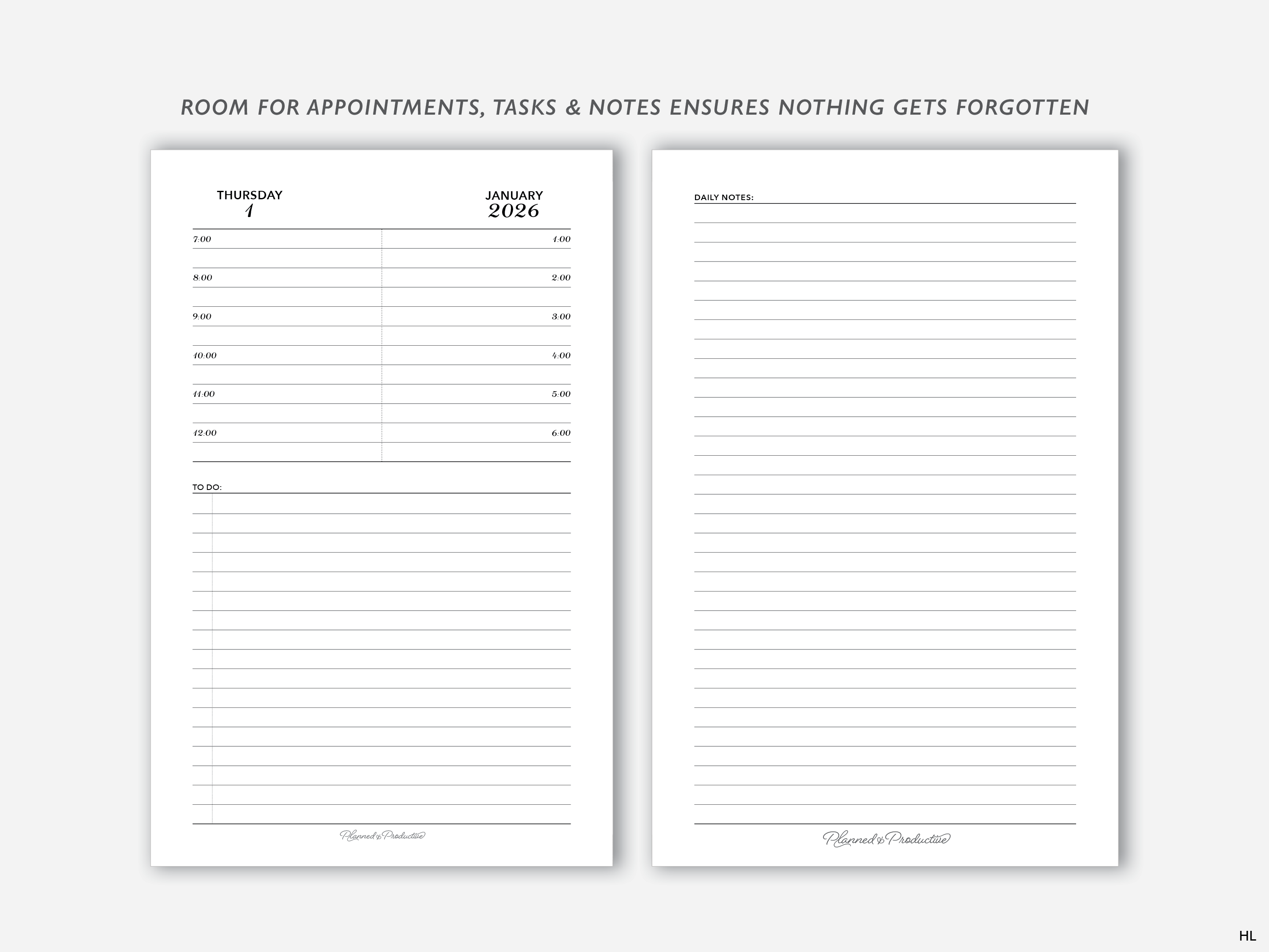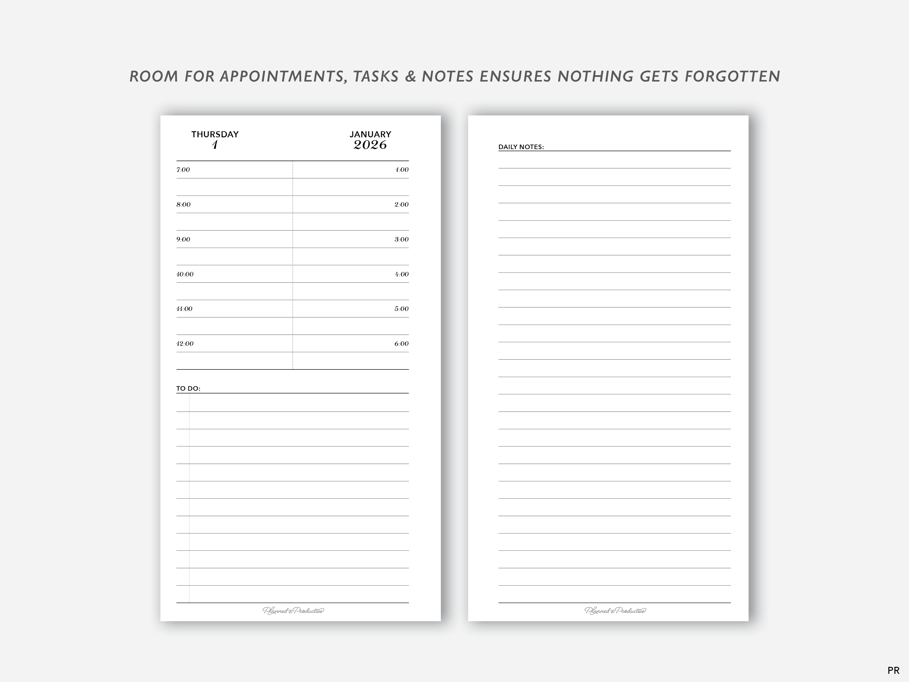 This is a two page per day planner insert, with weekly overview pages between each week.