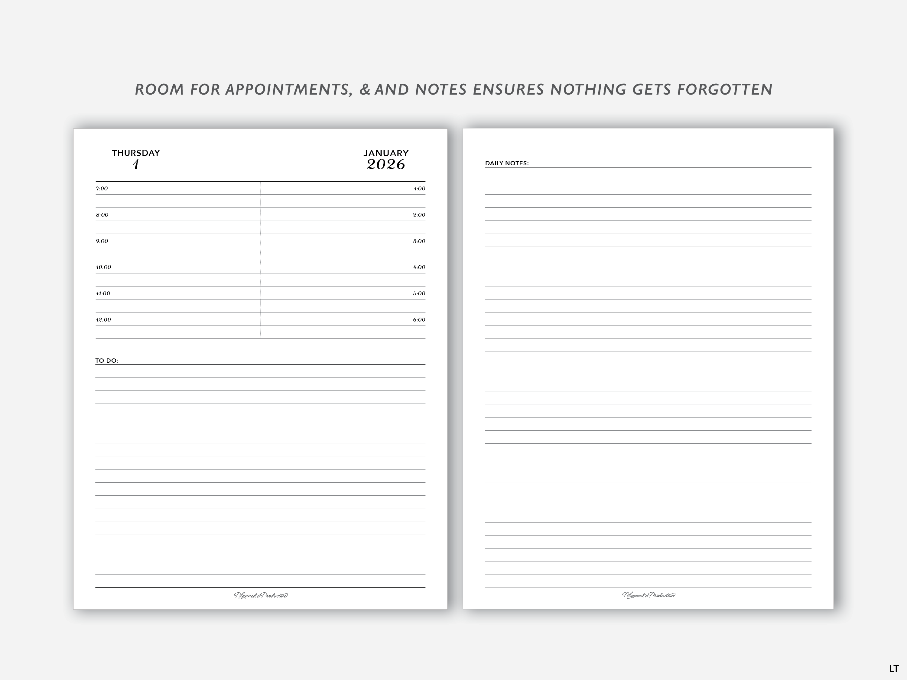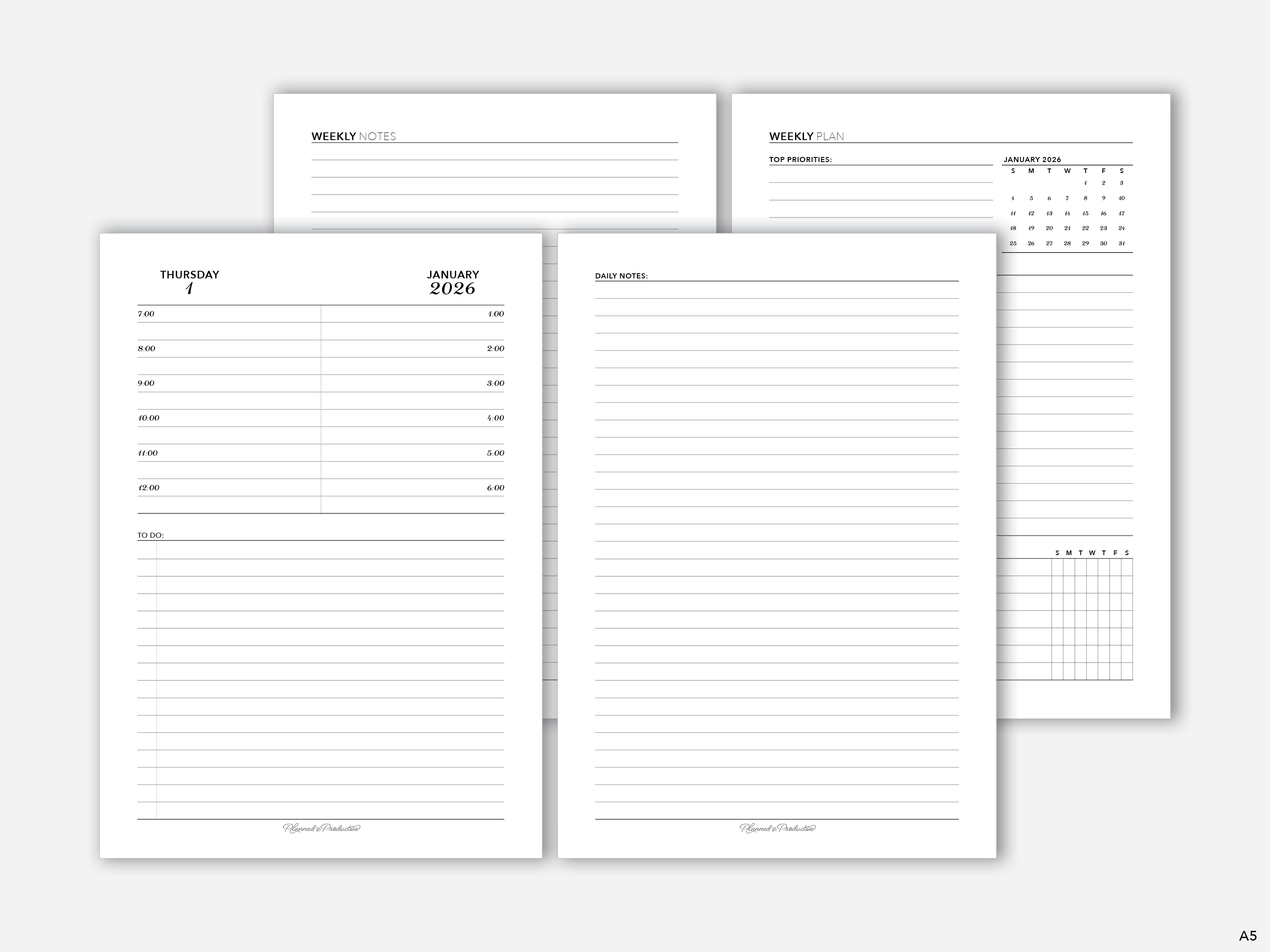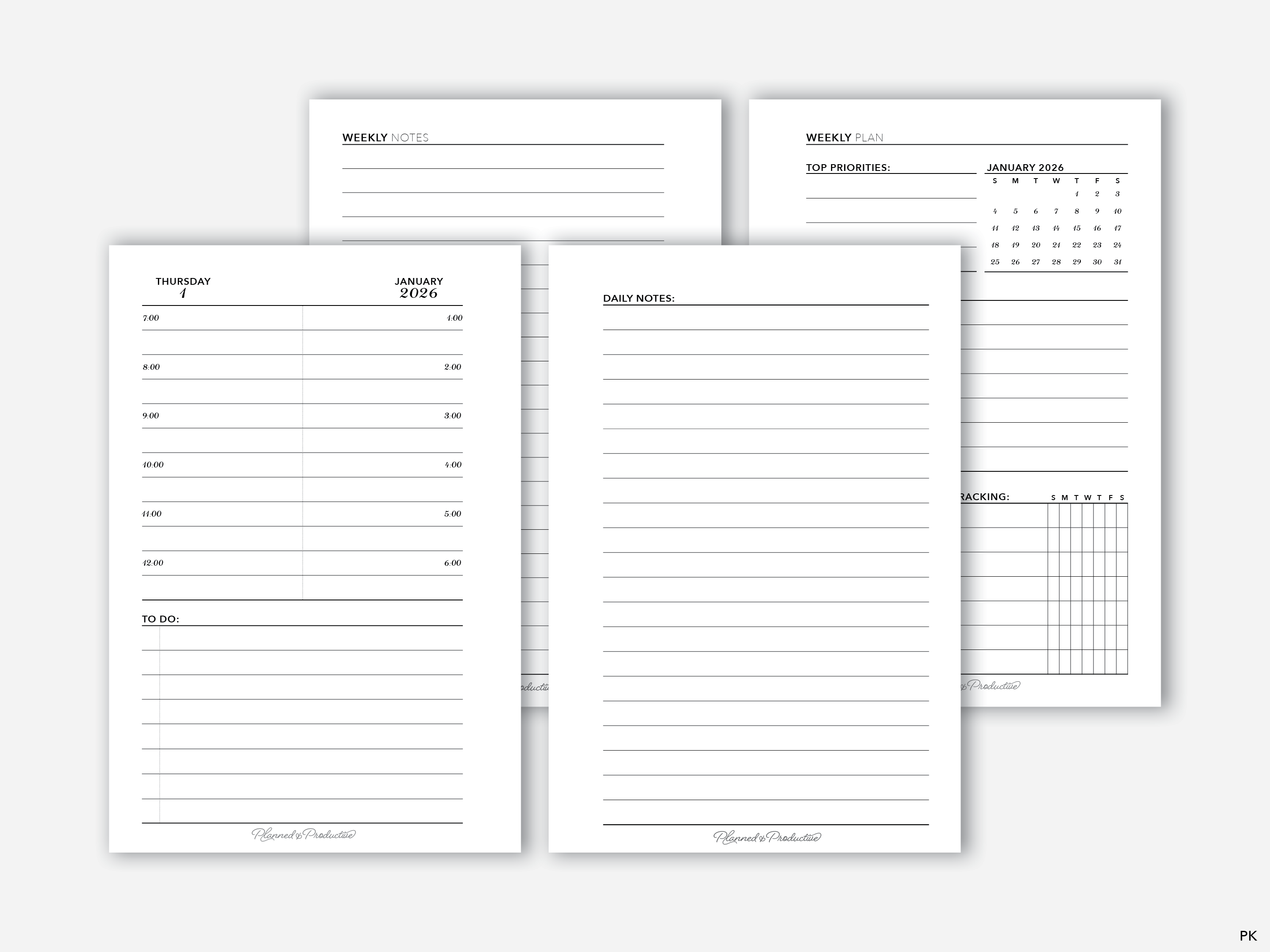 This is a two page per day planner insert, with weekly overview pages between each week.