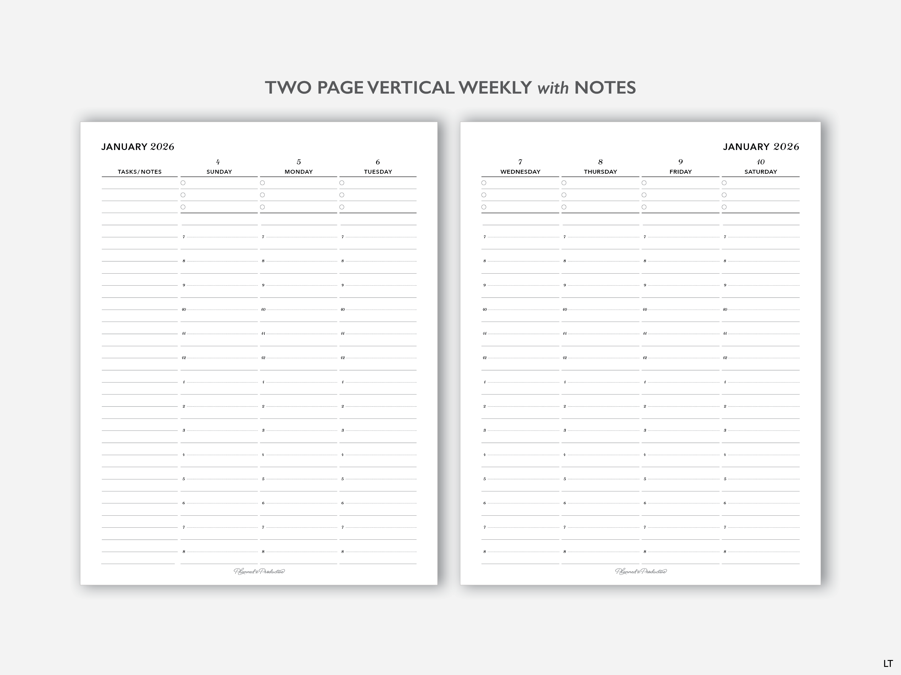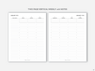 Stay on track and productive with this week on two page insert, which has a vertical timed layout, and room for your three most important tasks at the top of each day. It also includes a section for notes, lists or additional tasks, to help you stay organized.