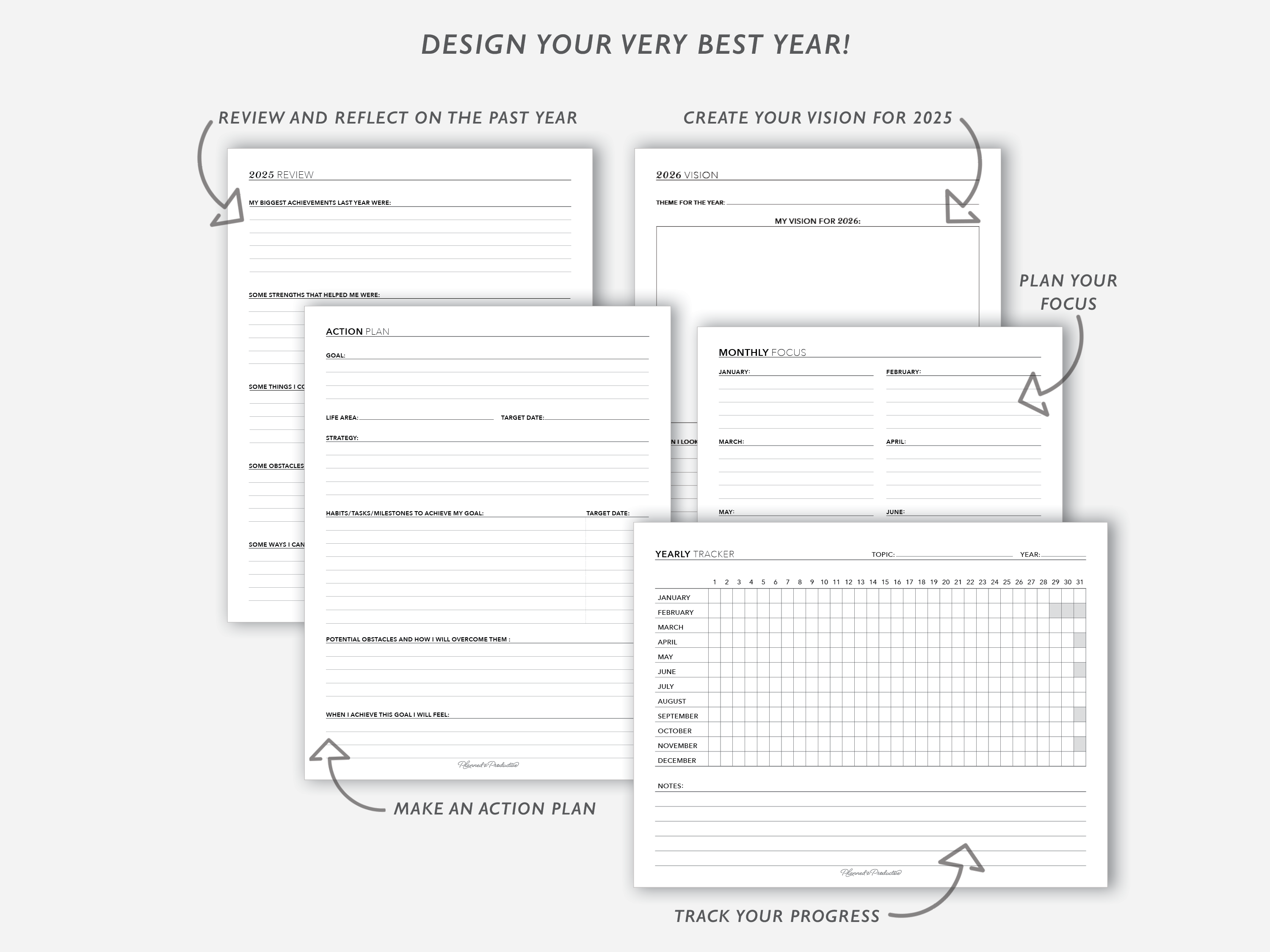 Design your very best year with this Goal Planning Bundle with Action Plan and Yearly Tracker pages included.